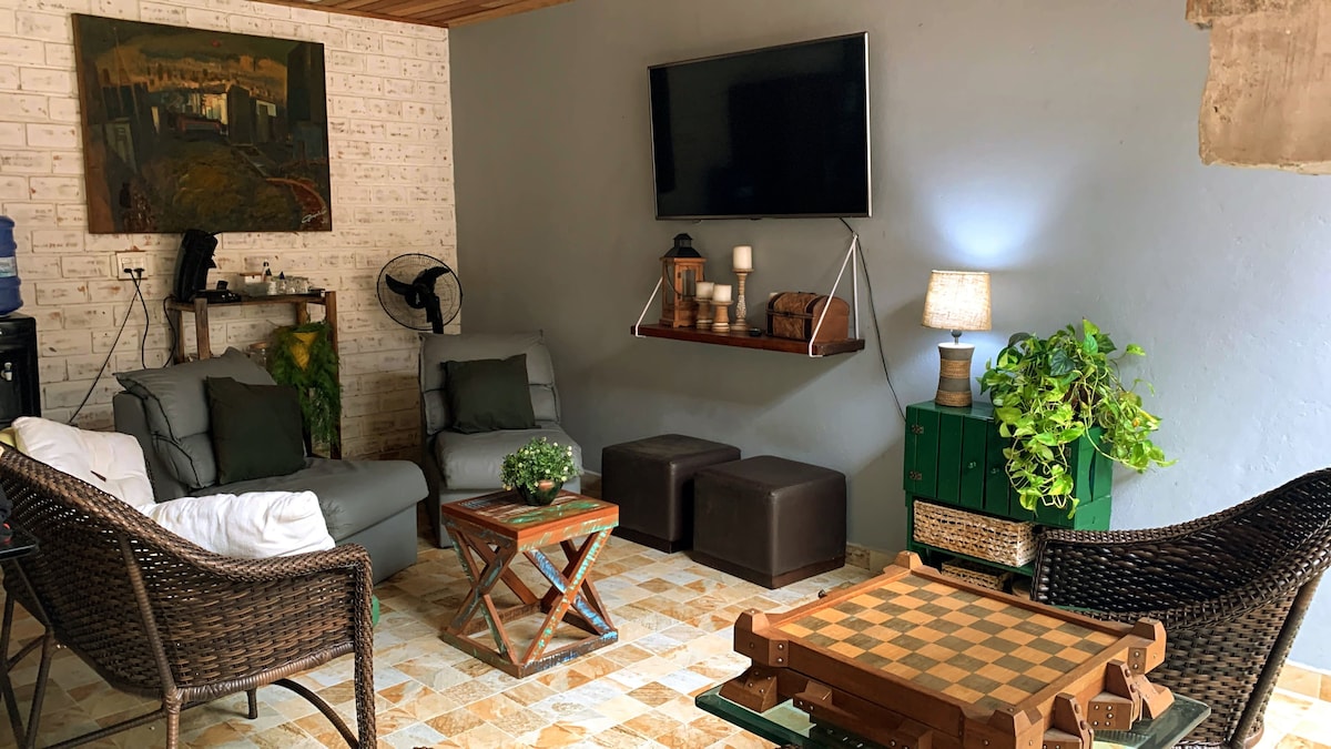 Diferente das iguais!!! Construida especialmente para casais ... que procuram privacidade! Lugar unico romântico diferente magico... UMA EXPERIENCIA RUSTICA & INTIMISTA... O ponto forte e a decoração artesanal em pedra e madeira! Quando entrar nao vai querer sair... Colchão de molas, Teto espelhado, Ar condicionado, Ventilador de teto, Rede Sky Total mais de 200 canais ,Netflix,WiFi e... Cozinha completa! 150 mts da praia. Tudo a Pe Estacionamento próprio!