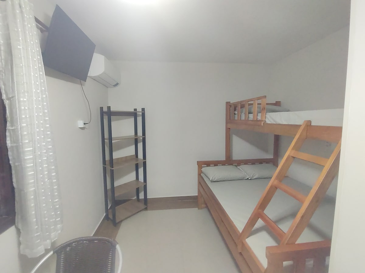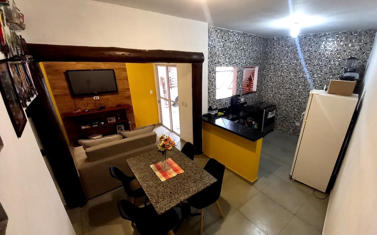 Casa sobreposta (somente parte superior) 1 dormitório (com uma cama de casal queen + 2 colchões avulsos de solteiro), 1 wc, sala, cozinha estilo americana (1 geladeira duplex) . Ventilador de teto no dormitório e na sala. 1 ventilador vertical . Casa toda 220V Mezanino com 1 colchão de solteiro. Para 5 pessoas. Trazer roupas de cama, mesa e banho.