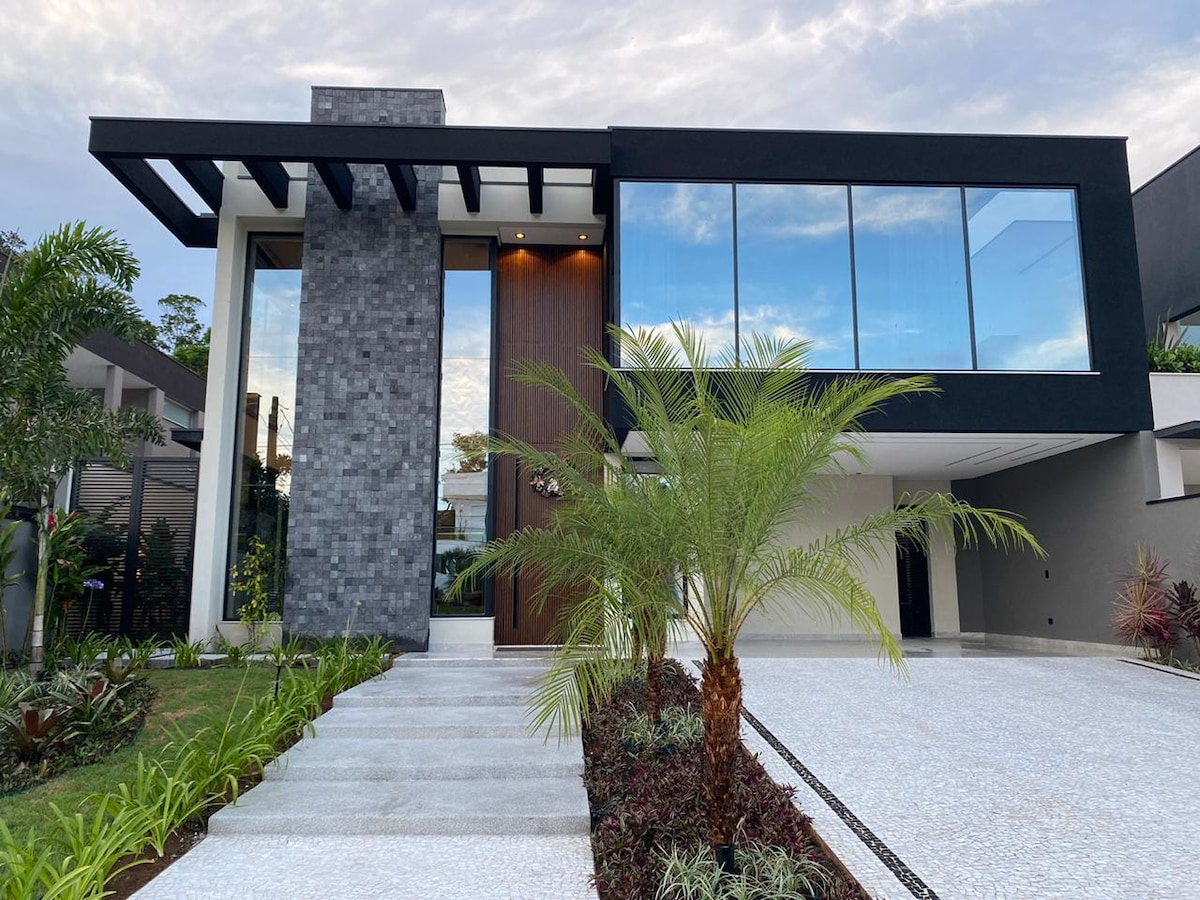 Excelente casa em condomínio fechado de alto padrão. A Casa possui 6 suítes (uma delas no térreo), todas equipadas com ar-condicionado e persianas elétricas. Home Cinema no segundo andar com ar-condicionado. Sala de estar e de jantar integradas com a cozinha no térreo. Espaço gourmet com churrasqueira, cervejeira e adega. Piscina com iluminação colorida em LED, cascata e rede para Biribol. Casa automatizada com Alexa. Ofurô com hidromassagem para 8 adultos.(aquecimento a combinar) A casa possui sistema de som integrado na sala de estar, sala de jantar, cozinha e na área da churrasqueira. Wi-fi nos dois andares da casa. Vagas para até 4 carros permitidas dentro do condomínio.