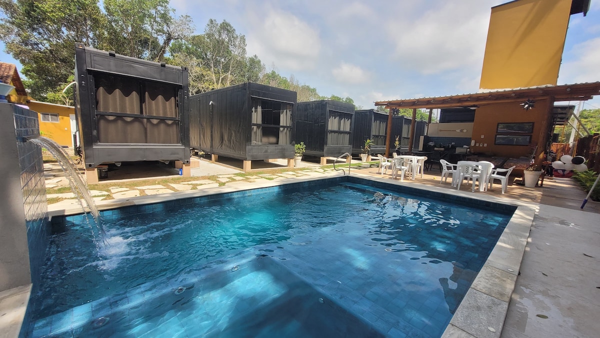 Suíte individual confortável feita em container, localizada próximo à natureza entre as praias de Riviera de São Lourenço e Itaguaré, duas praias maravilhosas da região, aproximadamente à 1km da praia. Nosso espaço conta com uma bela piscina com cascata, spa e prainha para as crianças, quadra de areia com rede para beach tennis/futvolei além da área gourmet com fogão e microondas. Lugar perfeito para relaxar e recarregar as energias