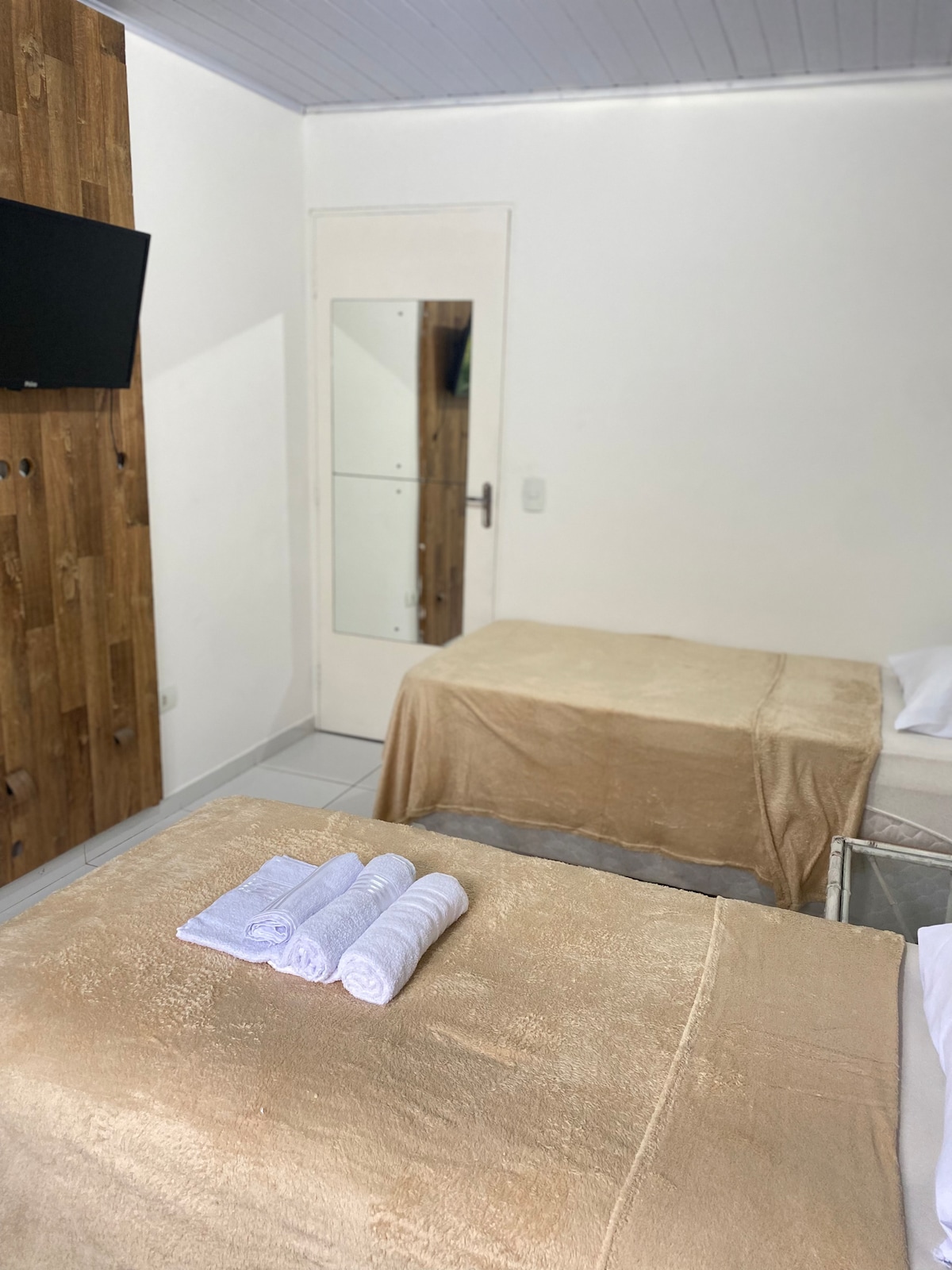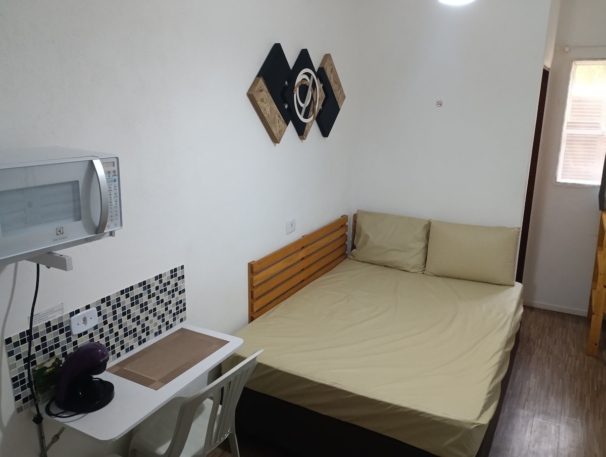 O quarto e muito simples , oferece um sofá-cama de casal e um colchão de solteiro , ventilador de teto banheiro com box, chuveiro com temperatura ajustável, tv de 32 polegadas, wi-fi, cozinha com panela multiuso, frigobar, sanduicheira, cafeteira, microondas, roupa de cama, sabonete e toalha de banho, pia e armário, e temos 1 vaga de estacionamento, no barrio tem supermercado, farmácia, padaria, o acesso a praia e fácil , indo de carro e 11 minutos e a pé 54 e de ônibus e 15 minutos.