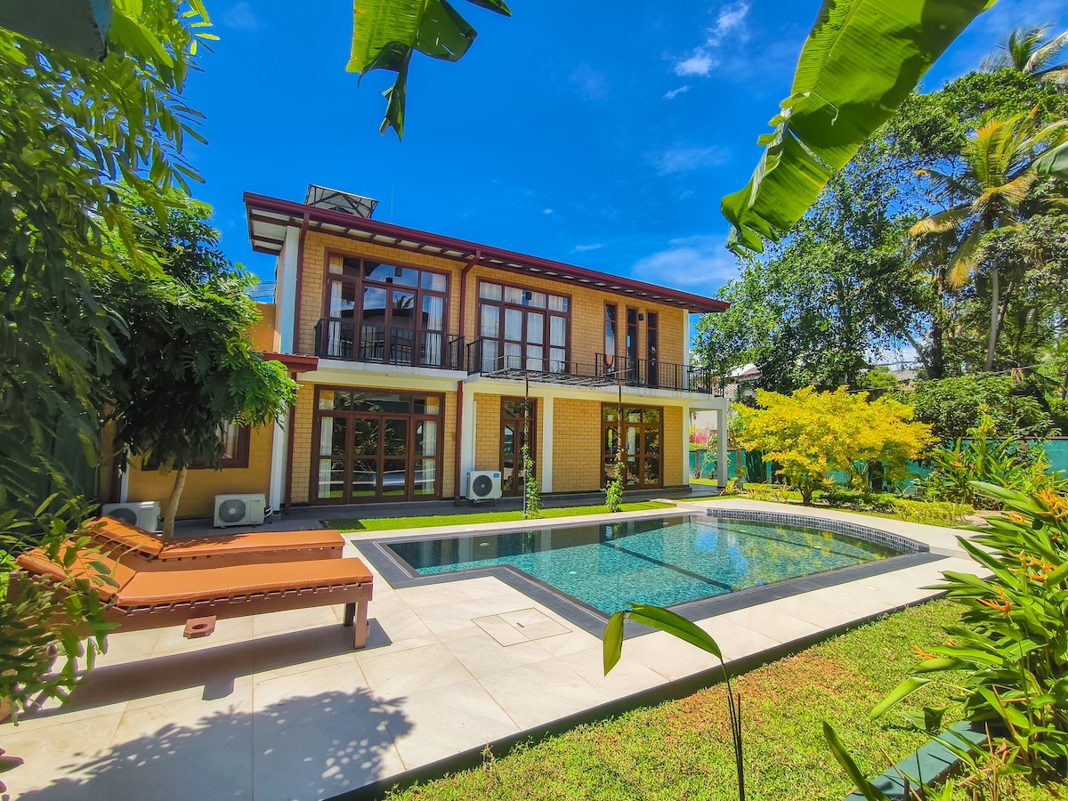 Tourist board and Safe and Secure certification for covid-19. Sitiuated 150m from the ocean in a serene and private area. We provide AC, Hot Water, Pantry, Gas, BBQ, Washing Machine, Fridge, Private Pool & jacuzzi, Air Port Pickup & Drop will be charged @ cheap rate . (Note : you can use Garden & entire upstair). 6km to Bentota / Madu River. 45 min to Hikkaduwa, Galle Fort & Unawatuna,Water sports, turtle farms etc are close. Breakfast not provided unless especially requested ($5each).