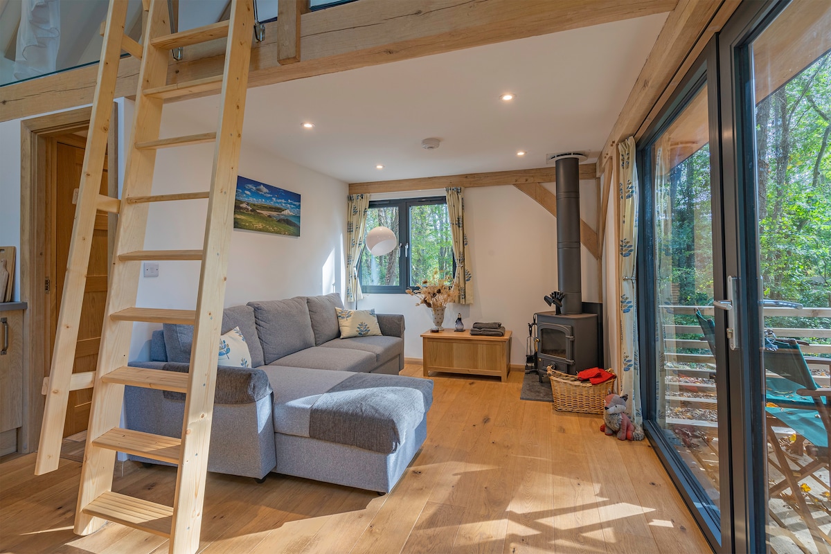 A beautiful oak framed building with great views of the south downs. Accommodation comprising of a comfortable lounge with TV and wifi and log burner. The kitchen is well equipped with a dishwasher, oven and microwave. One double bedroom downstairs with en suite shower room. Upstairs there is a mezzanine with two single beds and a sitting area above the lounge area with a bathroom with free standing bath. The outside space is a south facing patio with table and chairs and a BBQ is available.