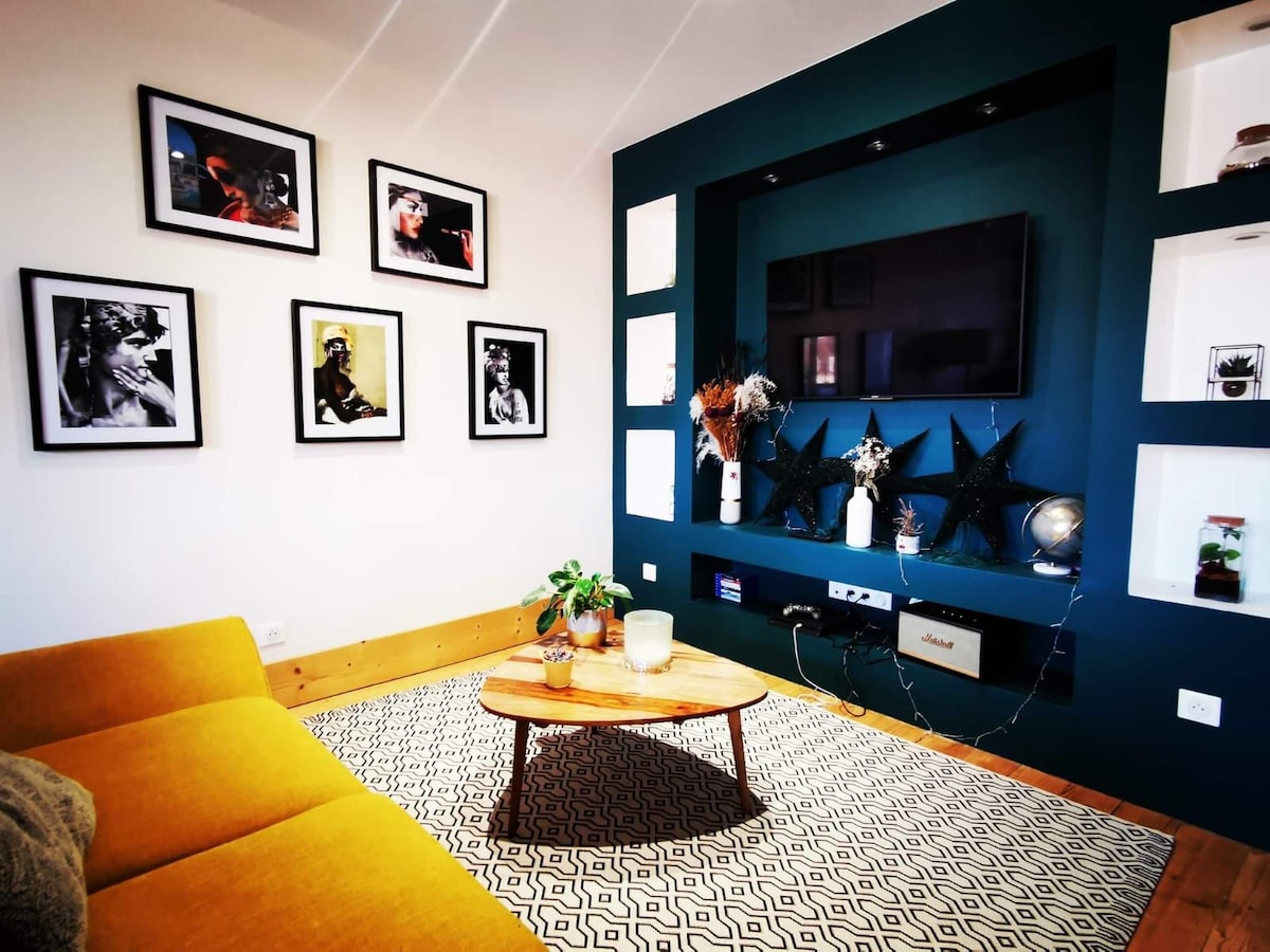 Appart style Loft, 60 m², plein centre ville Besancon. Petit balcon donnant sur l'entrée privé sur cour calme. Grande pièce à vivre : cuisine équipé (lave vaisselle, four pyrolyse, micro onde, plaque induction), table îlot (4 personnes), un petit bureau et un espace salon avec un grand canapé d'angle (lit très confortable 2 places) et TV. La SDB : douche italienne+baignoire double. WC séparés. La chambre : lit queen size, cheminée et alcôve avec lit superposé et dressing #draps non fournis#