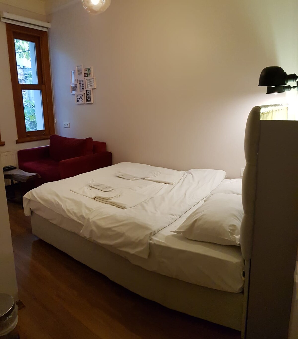Our room is luxurious, modern and carefully designed. Located in our hotel, this room has a large double bed, a 43-inch smart television and a private bathroom. Our room has a small kitchen with a mini fridge and small kitchen supplies. Our room is on the 3rd floor. There is a 24/7 camera and security system. The exterior door of the building is specially coded and protected. Our room is designed to accommodate 2 people.