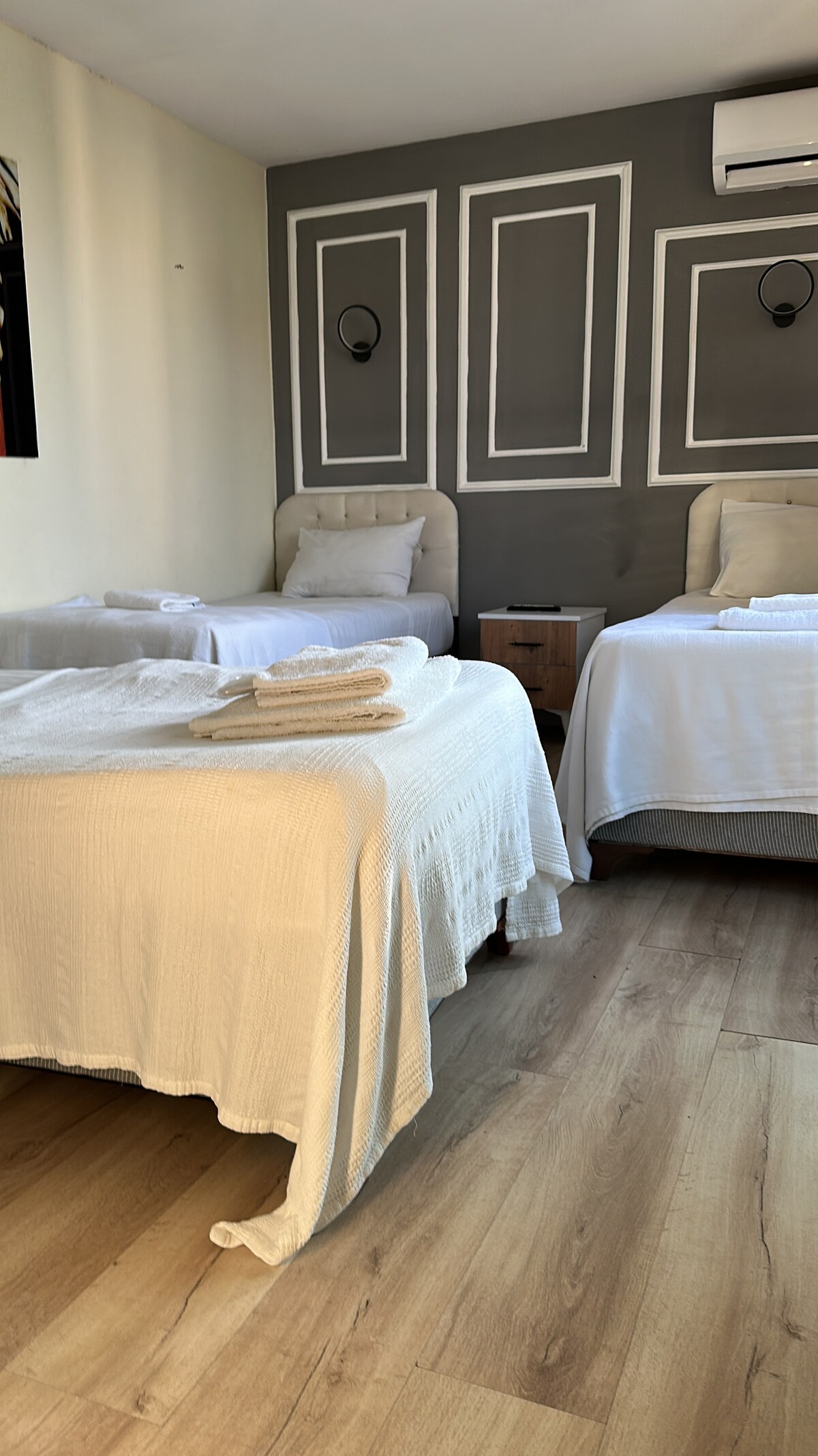 Our room is luxurious, modern and carefully designed. Located in our hotel, this room has a large double bed, a 43-inch smart television and a private bathroom. Our room has a small kitchen with a mini fridge and small kitchen supplies. Our room is on the 3rd floor. There is a 24/7 camera and security system. The exterior door of the building is specially coded and protected. Our room is designed to accommodate 2 people.