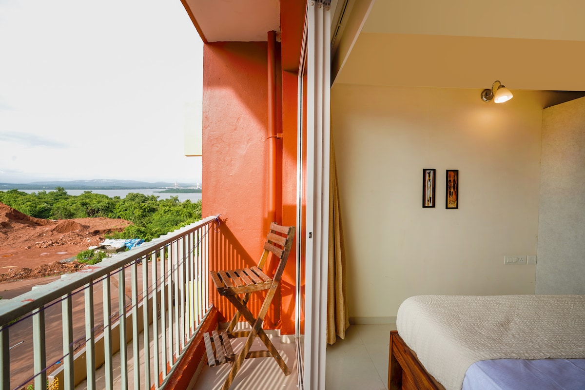 Two AC bedroom holiday home sits atop the Dabolim cliff, providing a great view of the river mouth from all rooms. This hidden gem boasts of spacious balconies to enjoy the sunrise - or sunset :) 5 minutes to the airport! Panjim or South goa is 30 mins by car Well furnished and has fully functional kitchen , RO, Microwave etc n wash/mac AC Living room with Smart TV. Access main full length pool , sauna bath, gym,squash, pool table and so on. Infinity pool swimming is restricted.