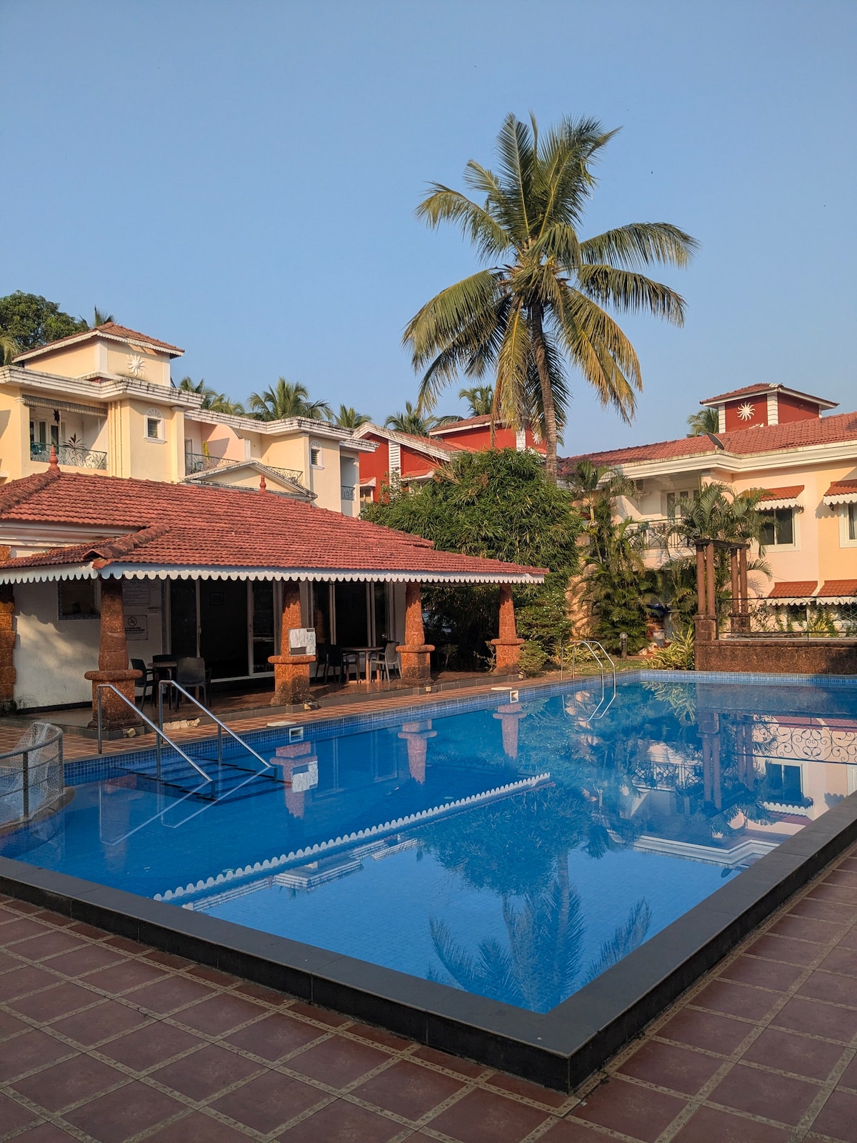 This is an aparthotel having 24 apartments with swimming pool, common dining & play area nestled in greens. Your apartment is approx. 720 sq.ft. Separate bedroom, living, kitchenette, sofa cum bed, bathroom, toiletries, 2 balconies. Color of furniture and interiors may vary as per availability. We are located 5/10 minutes by bike or car from the beautiful beaches of Majorda, Betalbatim, Colva, Utorda and best eating joints like Martins corner, Pentagon, Cota Cozinha,, Juju, Folga, Jamming Goat.