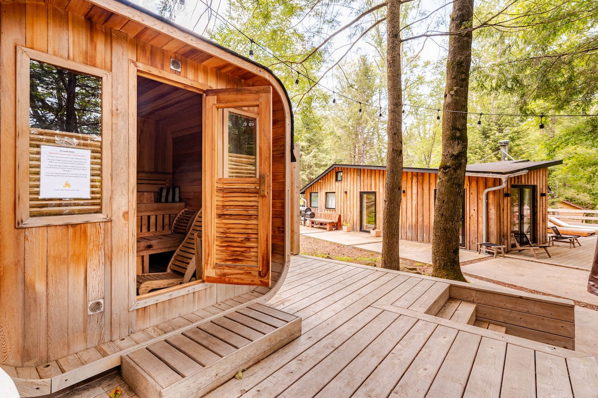 卡茨基尔山设计小屋|热水浴缸+桑拿+披萨