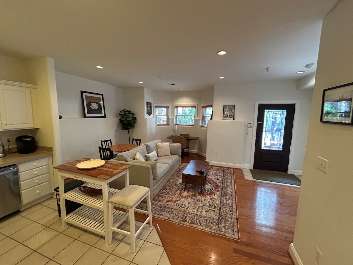 Welcome to our charming condo in the heart of historic Old Town Alexandria! Enjoy a fully equipped kitchen, cozy living room with a 55” smart TV, and a peaceful master bedroom with en-suite bathroom. With two private entrances, dedicated parking, and easy access to King Street’s dining, shopping, and metro, this home offers comfort and convenience. Perfect for relaxing after exploring D.C., or enjoying the charm of Old Town on foot!