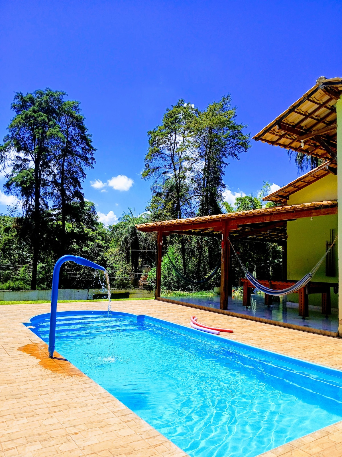 Country house with 3 bedrooms (two suites), main bathroom and large living room with fireplace. 7,000 m2 green area with complete leisure facilities: swimming pool, children's pool, sports court, hammocks, sun loungers and parasols. 30km away from Belo Horizonte, 2km from Cidade do Galo, with easy paved access up to the entrance. BONUS * Discounts from 3rd day (5%), 5th day (10%), 7th day(15%) * Children are charged only when older than 10 * Check-in from 12pm; check-out up to 4pm