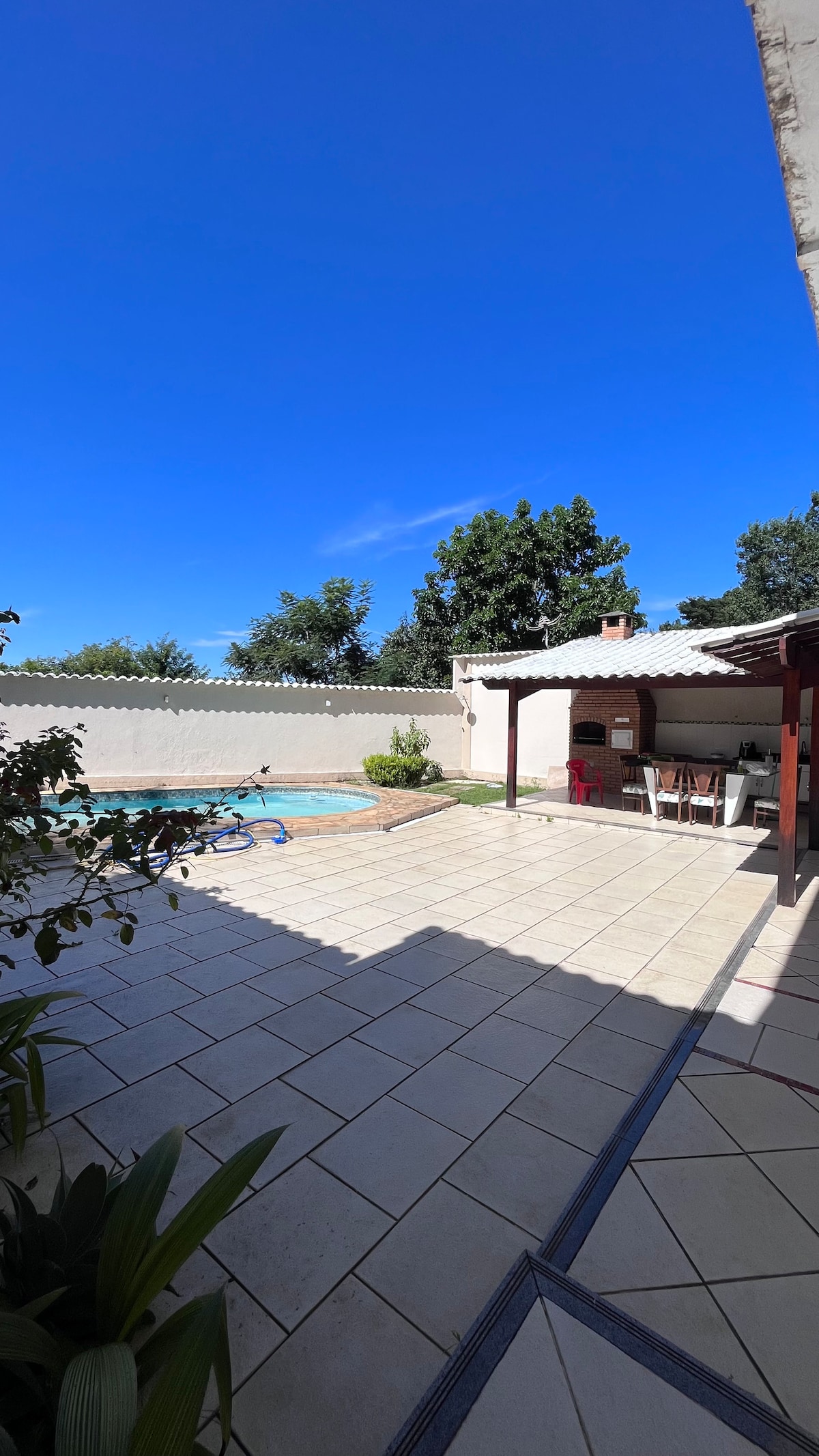 Imóvel composto pelo apartamento do hóspede e com a área gourmet acima dela. O apto. do hóspede é de uso privativo com entrada independente e estacionamento coberto. O apto tem 1 quarto de casal, sala com 1 sofá cama de casal e 1 de solteiro e dois colchões avulsos. Cozinha equipada e banheiro. Espaço gourmet equipado com piscina, fogão à lenha, churrasqueira e freezer. Após a área gourmet está localizada a casa do anfitrião.