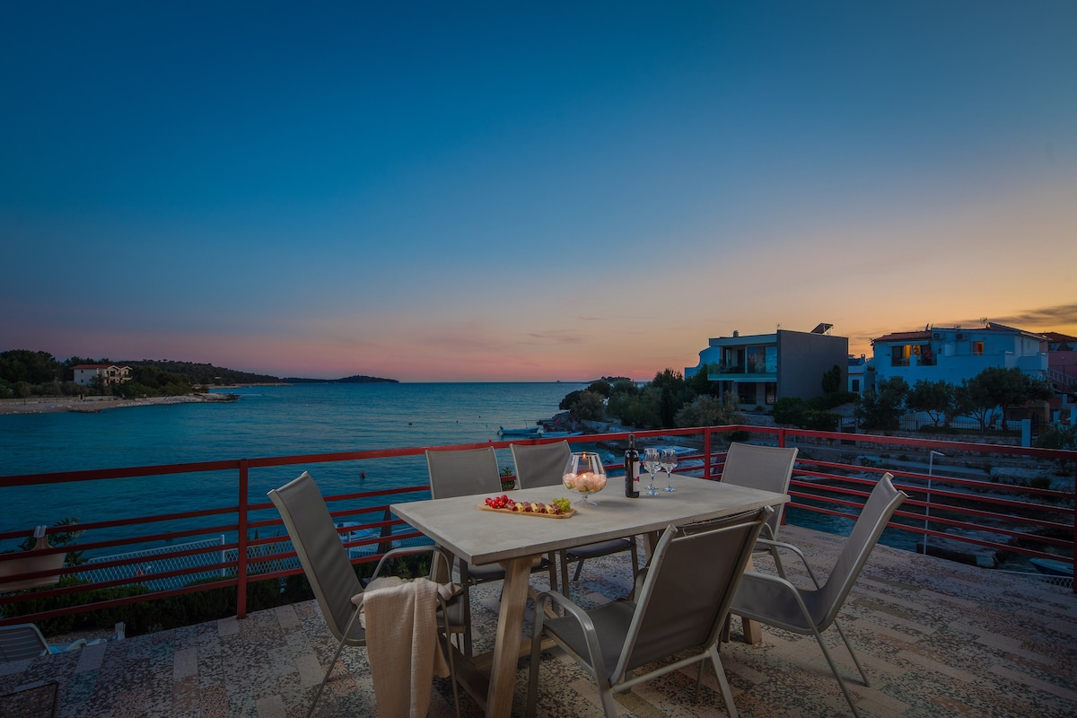 Beautiful completely renovated apartment on the first floor of family house situated on the beach front, surrounded by pines and overlooking the coast and the bay. The place consists of two bedrooms, bathroom, fully equipped kitchen, living & dining room. From the living room you come to the terrace with lounge and outdoor eating space, with retractable sunshades. The guests can use parking and outdoor BBQ in the garden. 5 to 10 minutes walk by the sea to the town center, 300m from market place.