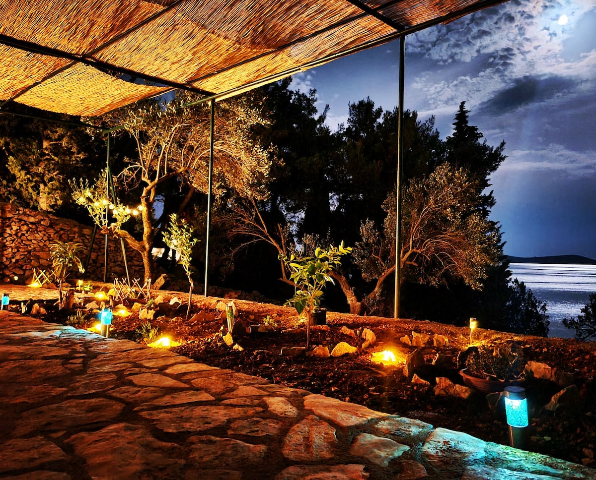 It is a small stone house of mediterranean style and rustical interior, situated at the bank of Prukljana in natural, untouched environment where everyone can find their own perfect peace.The house has its own beach with incredible sunset and the morning awakening with the sound of waves and birds will fascinate of this area.