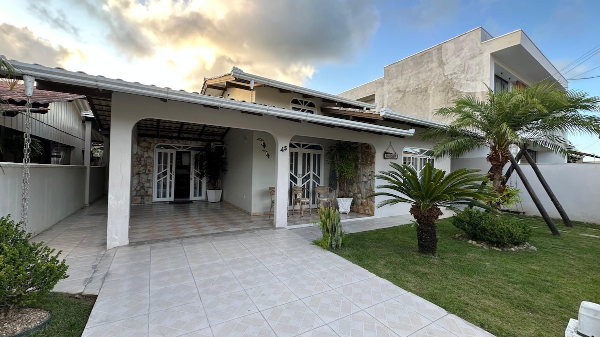 Casa térrea, confortável e completa, em rua residencial tranquila, a 750m da praia e cerca de 15km do Beto Carrero. Ideal para famílias com pets. São 3 quartos amplos (1 suíte), 2 banheiros, ar-condicionado em todos os ambientes, lareira e churrasqueira à carvão. Cozinha completa, lavanderia com lava e seca, filtro de água gelada, sofá-cama, PlayStation 4, berços, banheira kids e garagem para até 3 carros. Oferecemos roupas de cama, toalhas de banho e sabonetes. Mercado com padaria na rua.