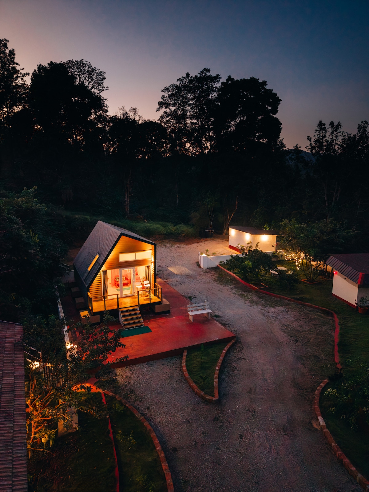 ECO-STAY CONTAINER CABIN IN COORG Tucked away in the lush greenery of our 70-acre estate in Coorg, this modern retreat redefines cabin stays. Crafted from a stylishly converted container, it features expansive windows that bathe the interior in warm, natural light, creating a serene atmosphere. Step onto your private balcony with a bonfire pit—perfect for unwinding and enjoying the crisp air and panoramic views of Coorg’s stunning landscape.