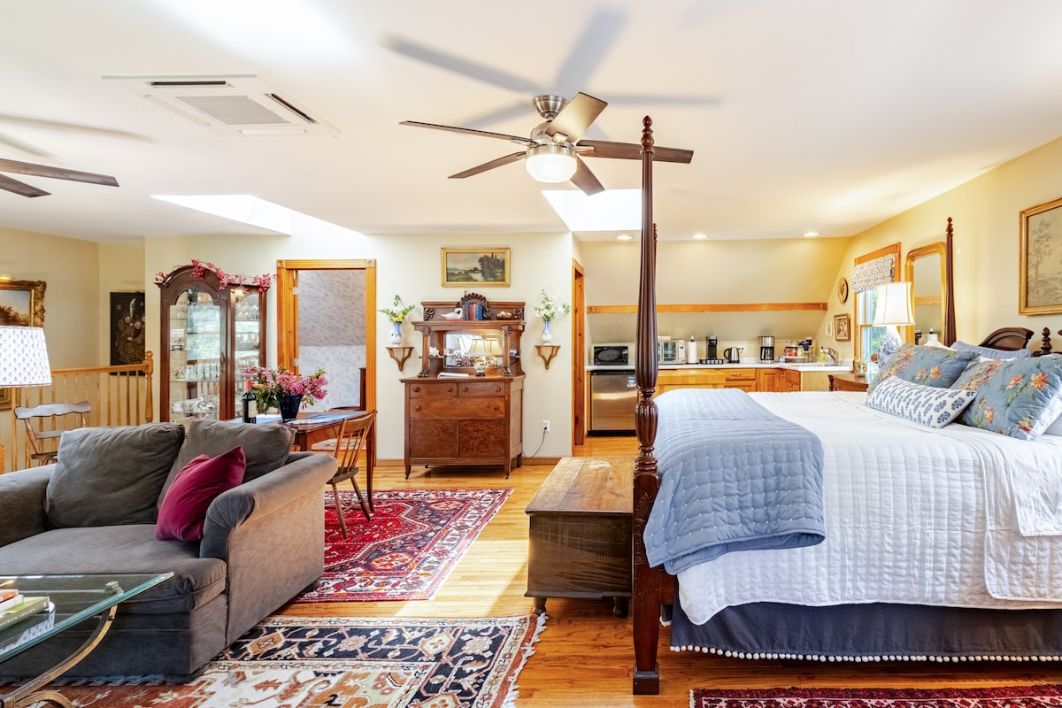 Escape to a secluded studio hideaway in the middle of Chestertown. Private parking, and over 1 acre of private gardens. Relax in front of the fire with views of gardens in the windows. Kitchenette has large toaster oven, hot plate, microwave, fridge, and Keurig/drip coffee makers. We have an under counter filtration system for pure delicious drinking water. King bed with deluxe linens and mattress, washer dryer. We also host ‘Wren Retweet”, a 5 bedroom house by the carriage house.