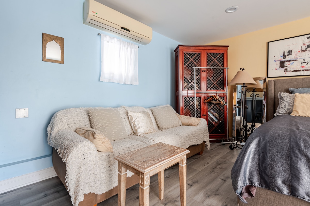 Experience a beautifully private guest house 400 SF with modern ful Bathroom complete with a luxurious California king bed, a cozy sofa, and a large flat-screen TV. Large refrigerator, a microwave, a coffee maker, and an espresso machine Take a 3 minute walk to Museum Row and The Grove, 20-minute walk to Beverly Hills. You'll also meet our friendly Milow golden retriever, who adores being petted and enjoys staying indoors. the perfect retreat, complete with a dedicated parking space! 🏡