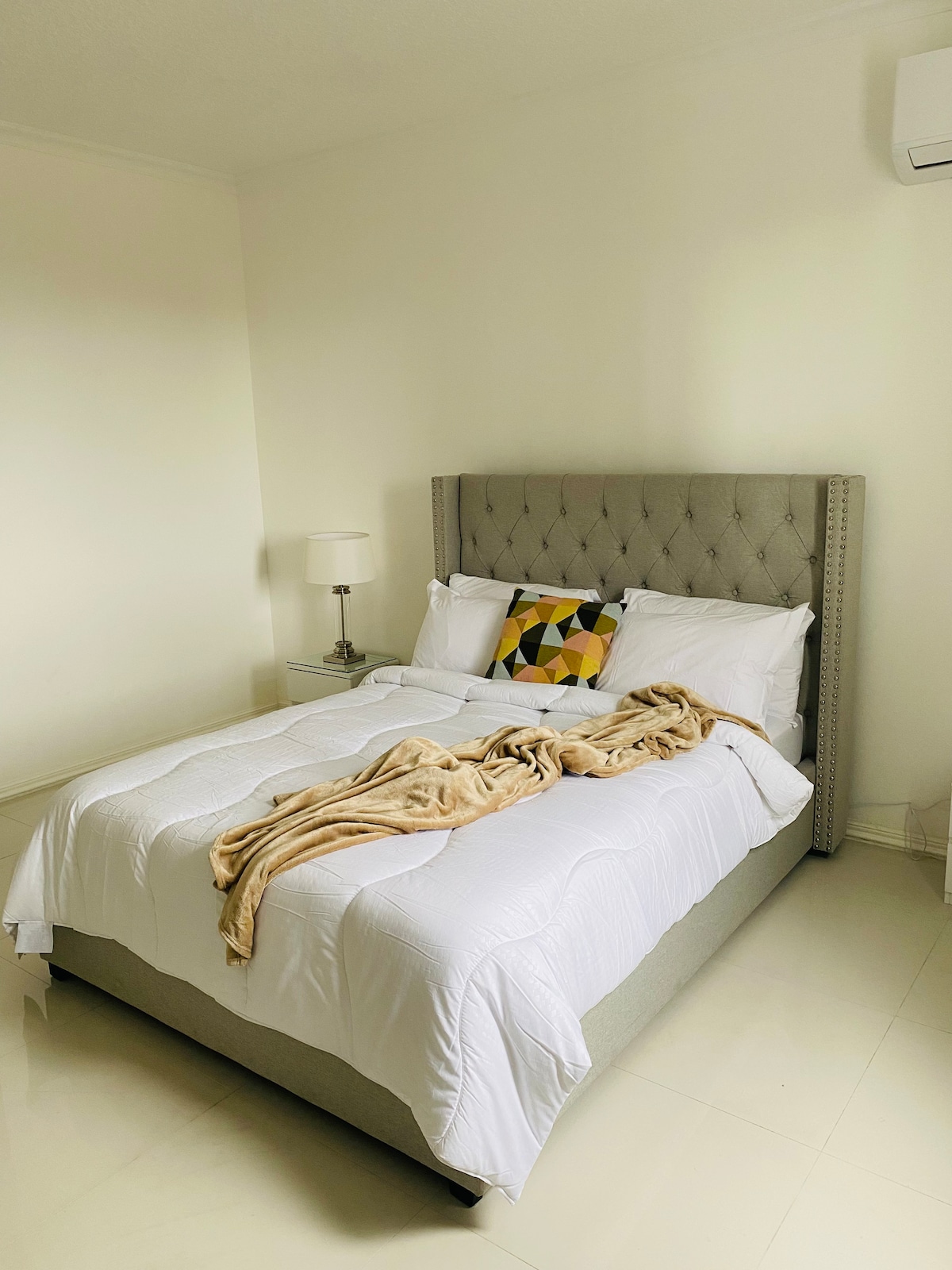 This bright and stylish centrally located 1-bedroom apartment is the perfect space for your stay. It’s Located within 8mins walking distance or 2mins drive to Starbucks, supermarket, pharmacy, and local restaurants. The contemporary living space has everything to make you feel at home Wi-Fi, local cable, Netflix, washer/dryer, ac units, king size bed, a well equipped kitchen and tableware. Have a glass of wine and enjoy the beautiful sunset on the balcony after a long day of work or play.