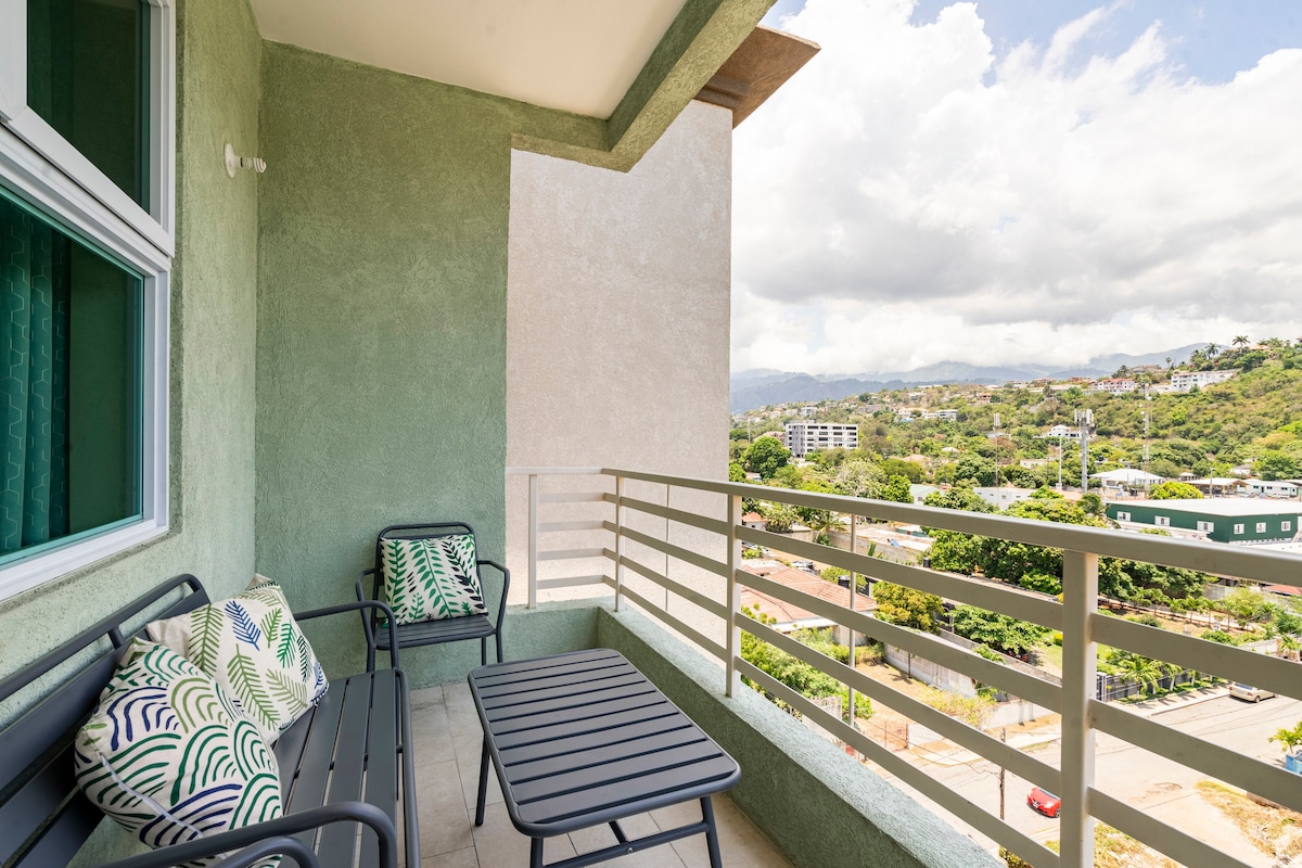 This modern apartment is located on the sixth floor with a breathtaking view of the city and mountains. The unit is a 2 bedroom, 2 bathroom condo that is fully air conditioned with gated 24-hour security, cable, WiFi, hot water, free parking, a fully equipped kitchen with a 4 burner electric stove and oven, modern appliances and large smart TVs in every room, including a 65 inch QLED in the living room.