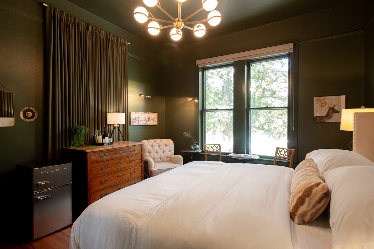 This room combines botanical curiosity with European charm, featuring peaceful pool views and serene comfort in downtown New Braunfels. Perfect blend of convenience and tranquility on the main mansion floor with easy access to all property amenities. Accessible Features: King bed with luxury linens Private soaking tub with stunning unlacquered brass fixtures First-floor accessibility Classic furniture with modern design touches Premium amenities: robes, toiletries, white noise machine