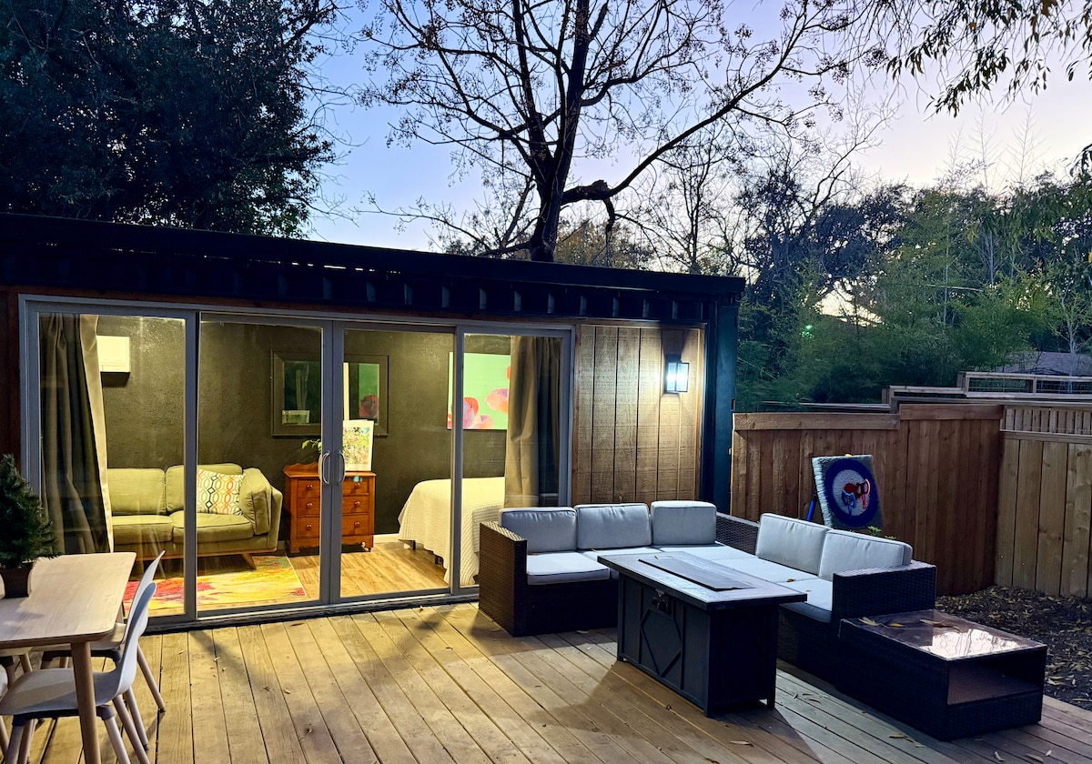 Experience the peaceful privacy usually found in the countryside, just minutes from the Riverwalk. This tiny container home (300 sq ft) has everything you need as well as a yard for your four legged family members. Walk to many of San Antonio's favorite restaurants, as well as to St Mary's Strip & Trinity U, under 5 min commute to the Pearl! The container home opens up to a private yard where you can enjoy the patio, fire up the grill and relax around the firepit.