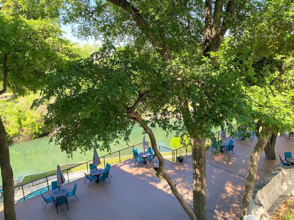 Walking to schlitterbahn !!Lovely decorated 2 bedrooms condo! with 2 super comfortable Tommy Bahamas king beds ,plus sofa beds ! Comfortably sleep 6 peoples each room has view of the Comal river ,river front balcony!not every condo has view like this.outdoor tables ,bbq grill!swimming pool by the river!walking distance to charming downtown New Braunfels ,where there are many shops, live music and excellent restaurants to dine out!please reach out for any questions! I will love to hear from you!