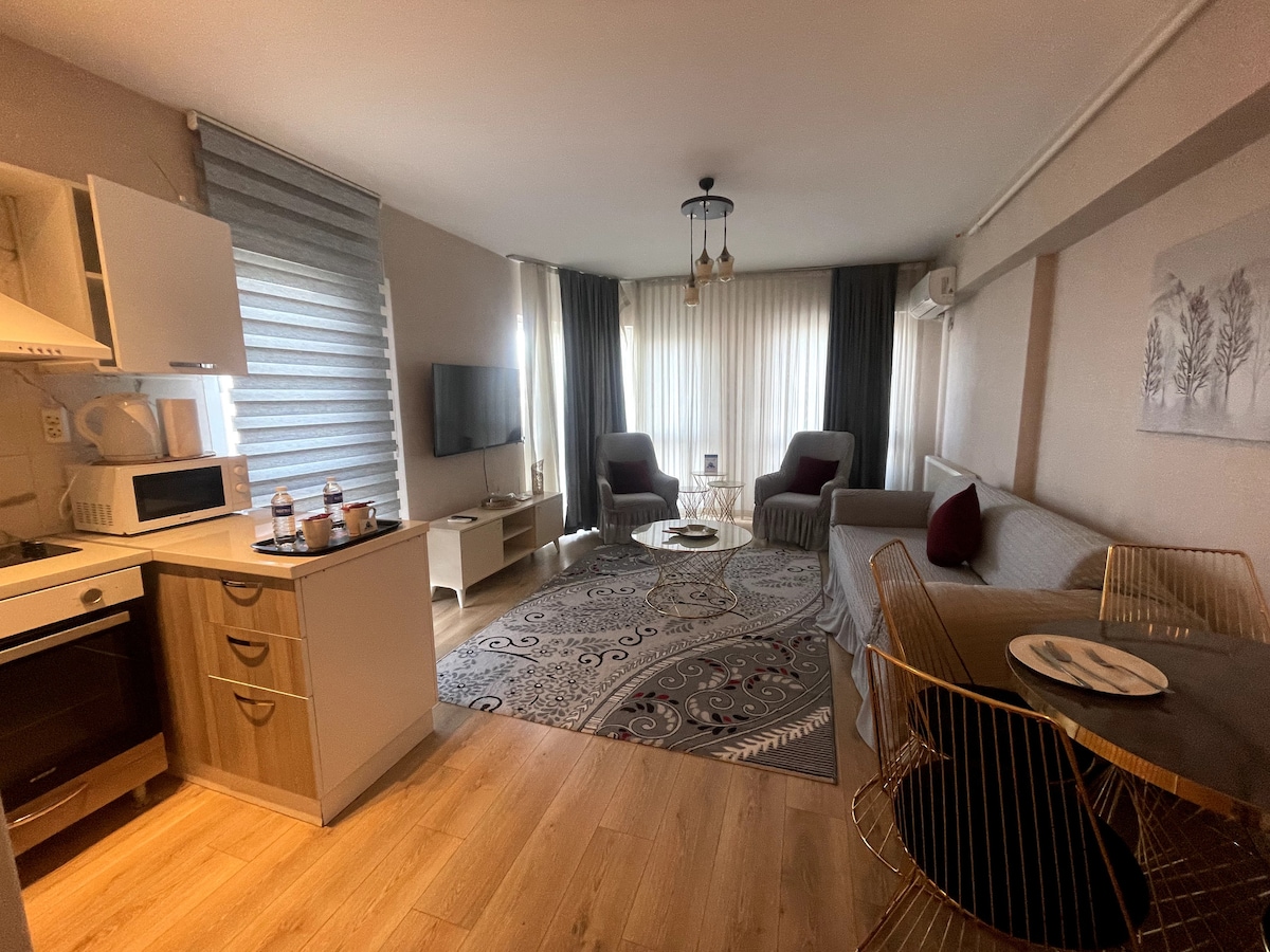 This beautifully furnished ground-floor apartment blends comfort and elegance, offering a peaceful retreat in a quiet area of Istanbul. Thoughtfully designed with warm tones and modern touches, the space includes all essentials: a fully equipped kitchen, high-speed Wi-Fi, a cozy living area, and a big terrace with outdoor seating—walking distance to Fuar Tuyap, Avenue Mall, and the metrobus line.