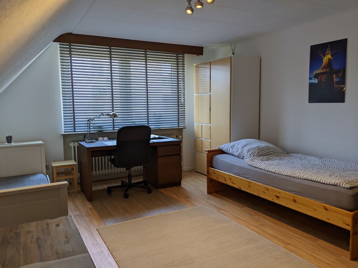 Meine Unterkunft liegt im ruhigen Stadtteil Auf der Weissmark, in unmittelbahrer Nähe des Naherholung und Naturschutzgebietes Mattheiser Weiher . Zur Innenstadt sind es 4 km, es besteht eine sehr gute Busanbindung. Das Apartement befindet sich im 2 OG und hat einen eigenen abschließbaren Eingang. Ein privater PKW Stellplatz befindet sich direkt vorm Haus. Das kleineTageslichtbad ist mit einer Dusche, WC und Waschbecken ausgestattet.