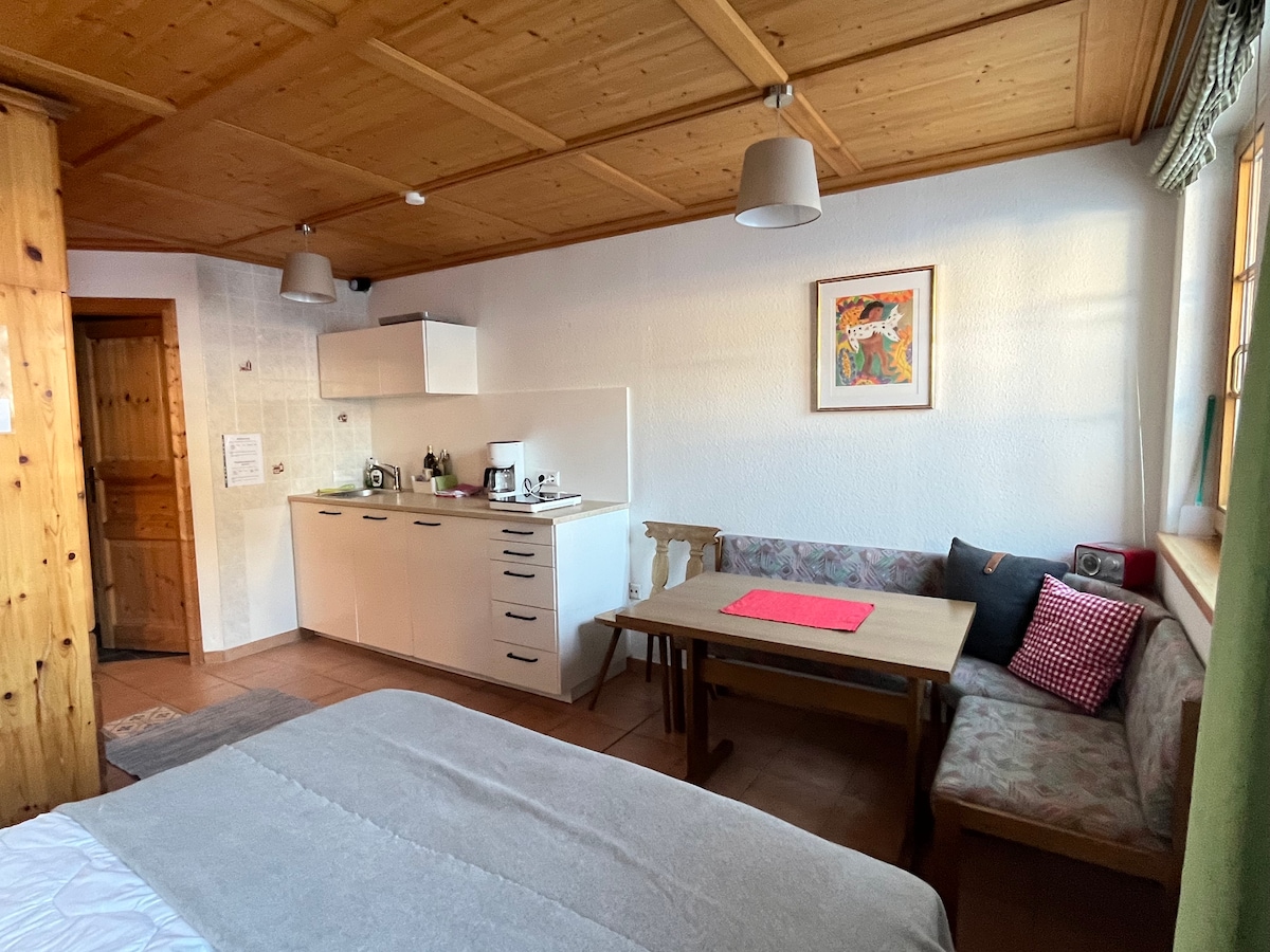 Helles, geräumiges Apartment inmitten des Bregenzerwaldes. Geeignet für zwei Personen. Vollausgestattete Wohnküche mit Esstisch, Relaxsessel, gemütlichem Bett, Badezimmer mit Dusche und WC. Modern apartment retreat with fantastic view over the whole valley and into the stunning austrian Alps. Apartment with extraordinary comfy charme, located above Schwarzenberg, Vorarlbergs finest village. Perfect for a couple.