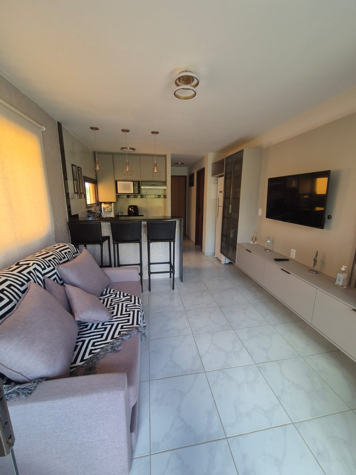 Nosso flat possui quarto contendo uma cama de casal + 1 colchão de solteiro extra. A sala conta com um sofá cama e a cozinha é equipada com eletrodomésticos diversos, além de conjunto de jantar e panelas. O banheiro é bem completo e possui água quente. E o nosso quarto conta com muito conforto, além de uma linda vista da varanda. Obs.: Tanto o quarto quanto a sala possuem AR CONDICIONADO. NOSSO FLAT FICA NO MÓDULO 1 (módulo mais perto da área de lazer), assim como está descrito em uma das fotos.