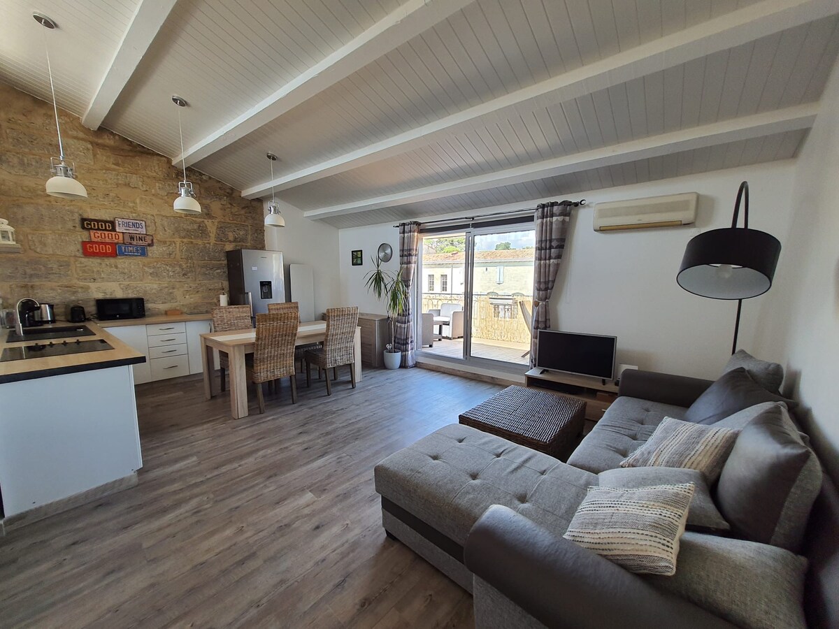 Beautiful 50 sqm character apartment, peacefully located in the courtyard of a historic 1850 building. Set on the 2nd floor with no elevator (spiral staircase), it enjoys an exceptional location in the heart of Narbonne, just steps from Les Halles. Elegantly renovated, it features a cozy living room with sofa bed, equipped kitchen, workspace and a lovely suite with a dressing room. Perfect for a comfortable and authentic stay.