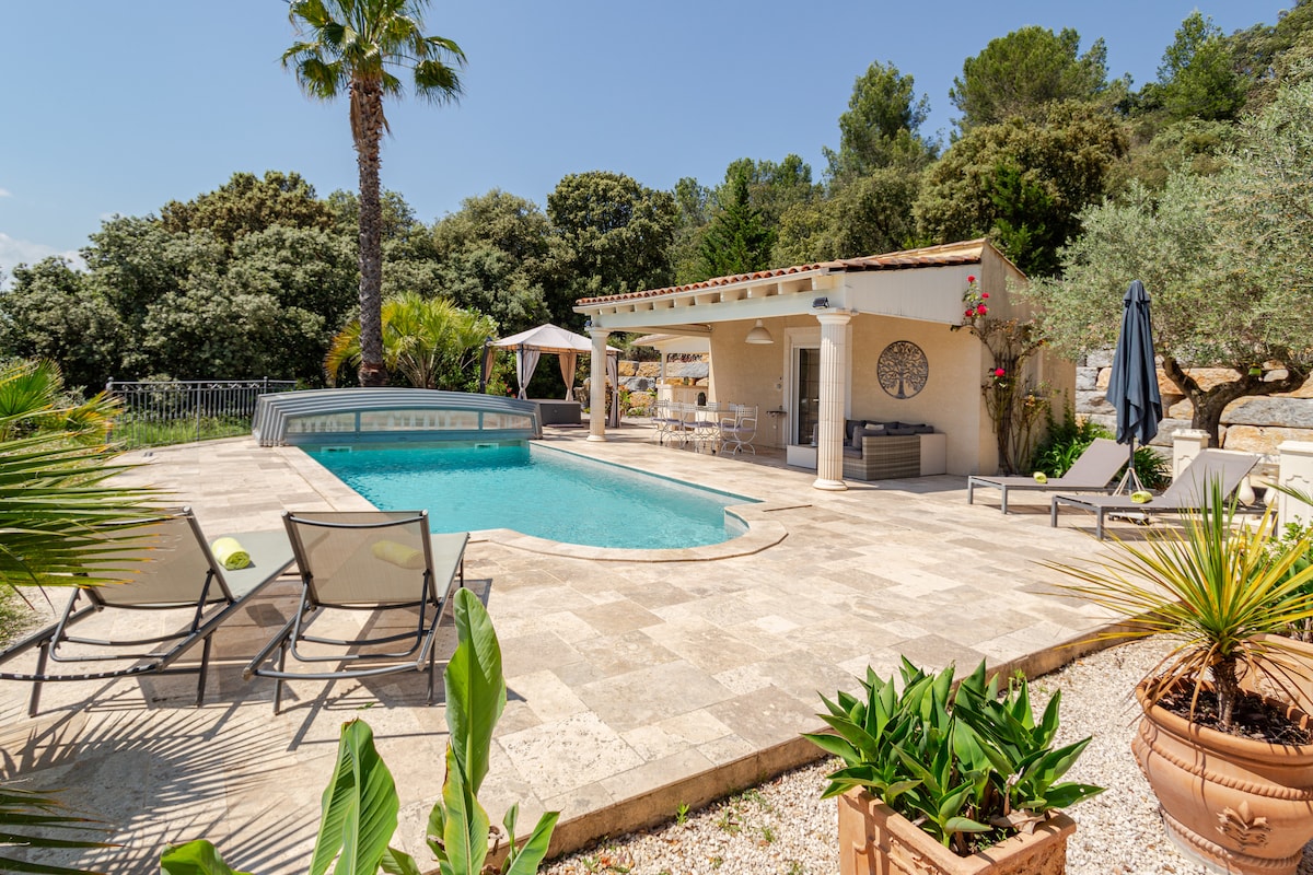 Non partagé et niché au milieu de chênes verts dans un environnement protégé et entouré de vignes. Le domaine de 2 ha entièrement clos , se trouve à moins de 5 mn de toutes commodités, vue exceptionnelle à 360°.Pièces climatisées.Extérieur(2ha clos).Piscine 10x5 à déb. et chauffée, spa, pool house, BBQ, vest/WC, douche. Terrasse priv.La région offre de nombreuses distractions culturelles, sportives et festives à proximité Possibilité d’organiser un week-end personnalisé.