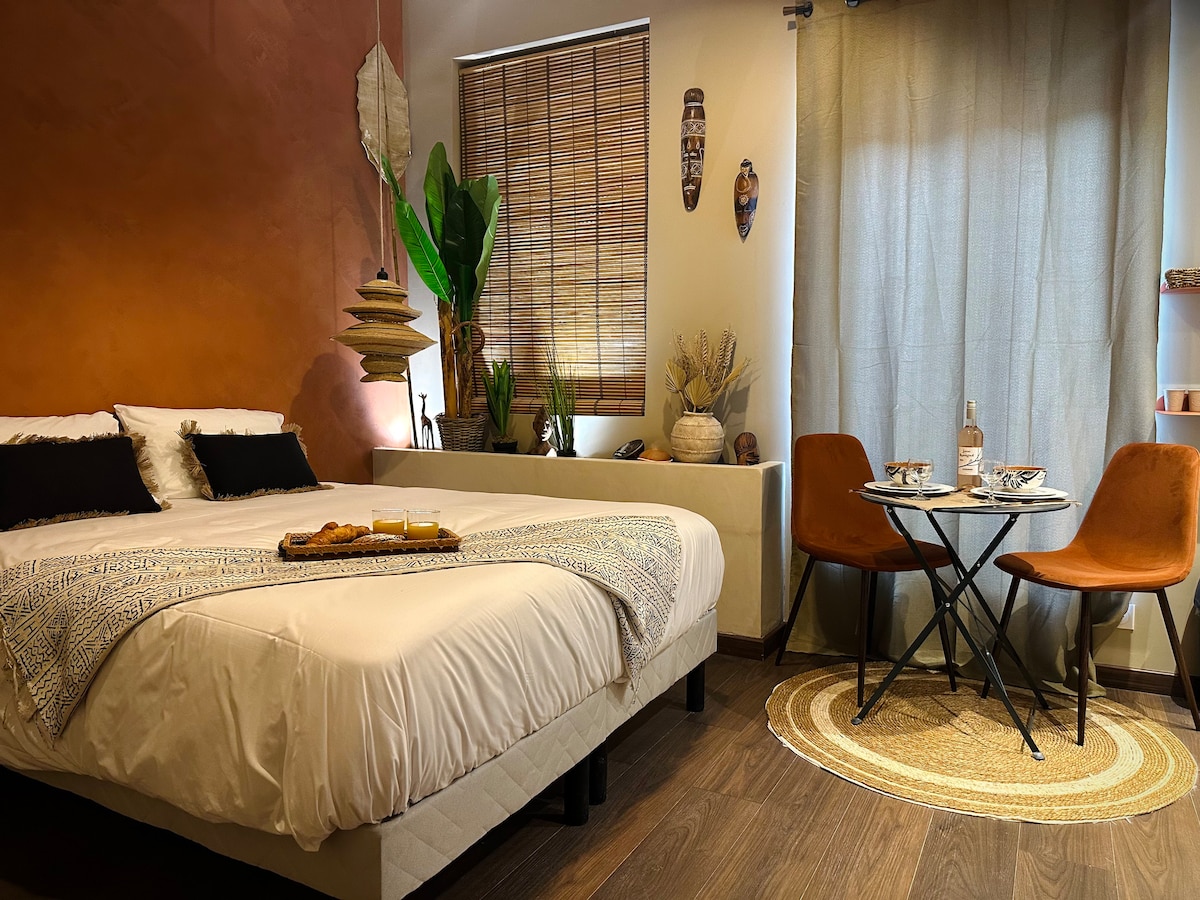 🌺 Le Jacaranda ~ Sauna , climatisation, Netflix 🌺 Un refuge sensoriel aux inspirations africaines idéal pour une escapade romantique, un anniversaire ou simplement un moment hors du temps à deux. détendez-vous, on s’occupe du reste. Ici, chaque instant devient une invitation au voyage : senteurs envoûtantes, lumières tamisées, matières naturelles… tout a été imaginé pour éveiller les sens et nourrir l’âme.