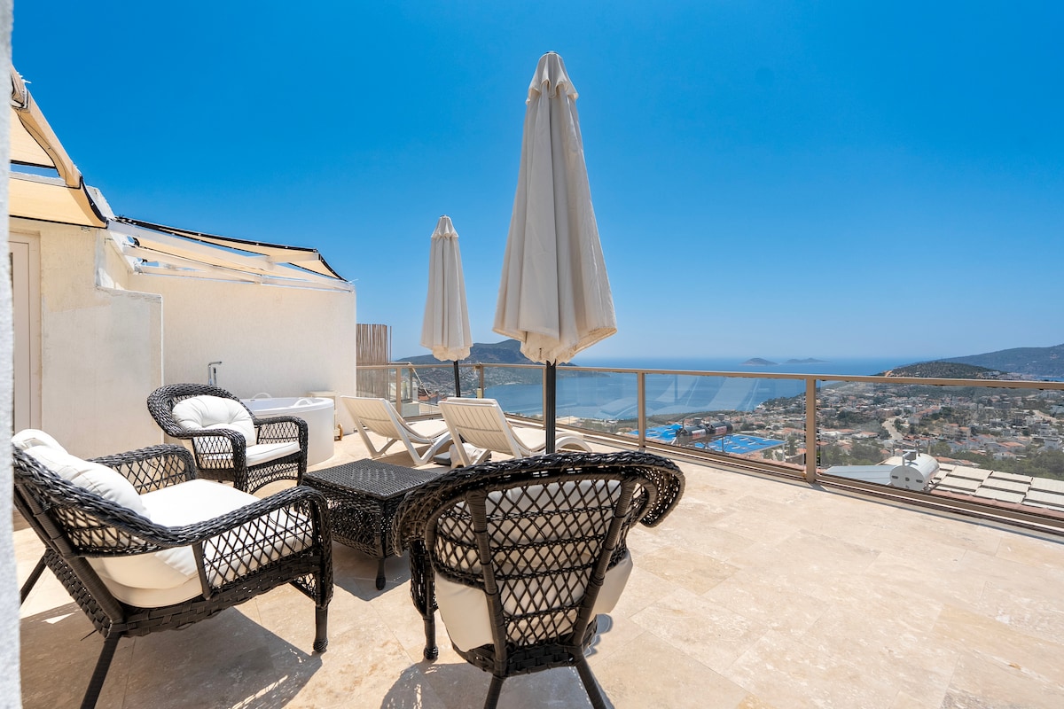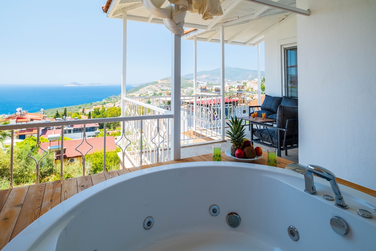 Kalkan merkeze yaklaşık 3 km olan villamızın yatak odasında jakuzi ve ebeveyn banyosu bulunmaktadır. Oturma odası ile birleşik açık plan mutfak mevcuttur. Geniş havuz terasında yemek masası, 2 şezlong, şömine ve 2 kişilik salıncak; villamız içinde ihtiyaç duyabileceğiniz mobilya mutfak araç gereçler vardır. Villamızın havuzu yerden yüksek olmakla birlikte, havuz terası ahşap çitlerle çevrilmiş ve korunaklı hale getirilmiştir. Muhafazakar aileler ve balayı çiftleri için her şey düşünülmüştür.