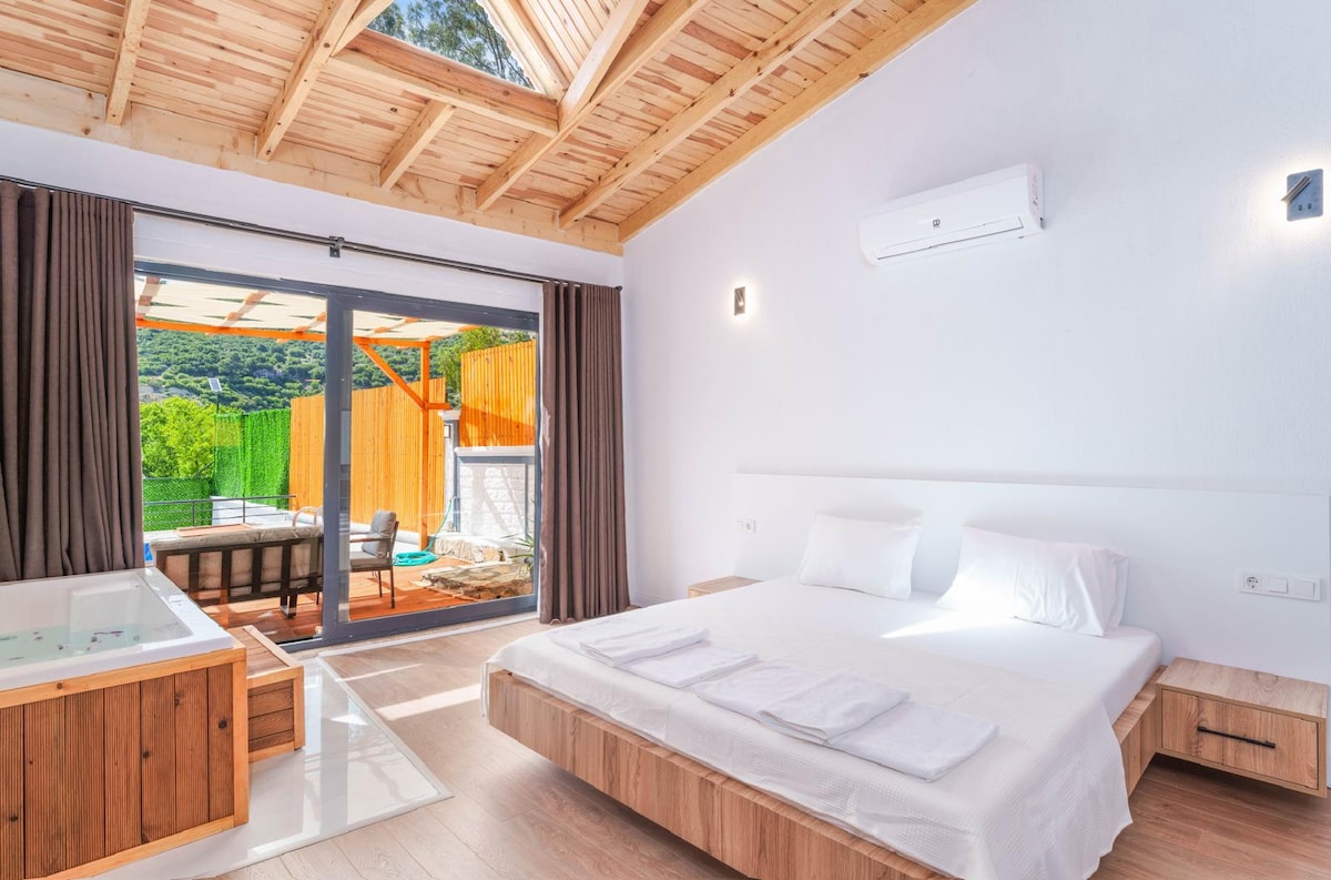 Kalkan merkeze yaklaşık 3 km olan villamızın yatak odasında jakuzi ve ebeveyn banyosu bulunmaktadır. Oturma odası ile birleşik açık plan mutfak mevcuttur. Geniş havuz terasında yemek masası, 2 şezlong, şömine ve 2 kişilik salıncak; villamız içinde ihtiyaç duyabileceğiniz mobilya mutfak araç gereçler vardır. Villamızın havuzu yerden yüksek olmakla birlikte, havuz terası ahşap çitlerle çevrilmiş ve korunaklı hale getirilmiştir. Muhafazakar aileler ve balayı çiftleri için her şey düşünülmüştür.