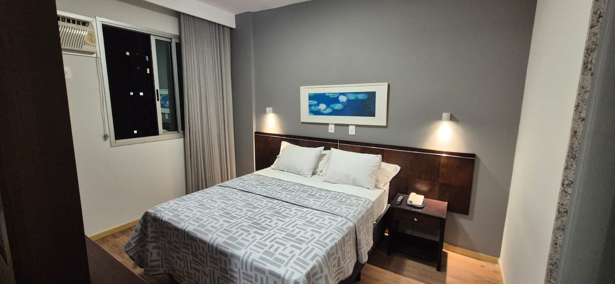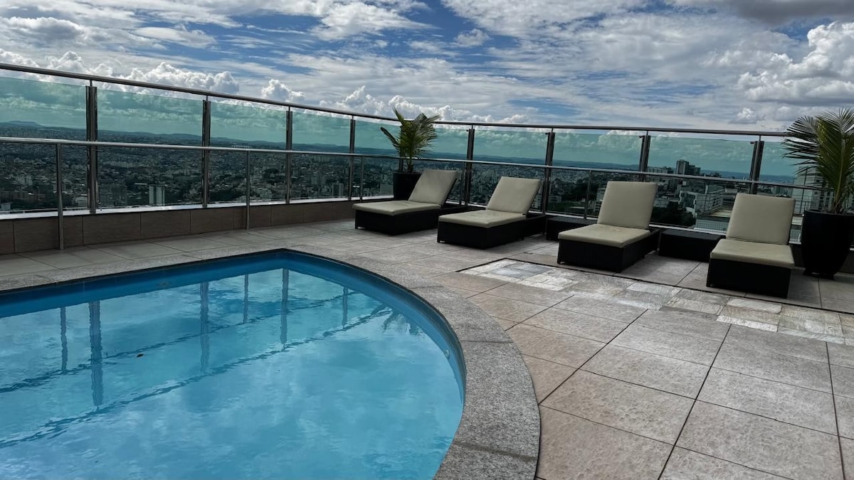 Com 70 m2 , para quem quer privacidade e independência . Na Savassi à duas quadras da Praça da liberdade e do Shopping Pátio Savassi. Com uma suíte, banho reversivel social , sofa cama para hospedes, janela da suíte antiruídos, ar condicionado quarto e sala, wifi300 megas, smartv de 75 polegadas , Hometheater, cozinha completa , microondas, serviço de quarto, camareira, manobrista, piscina , academia, sauna, restaurante e portaria 24horas.