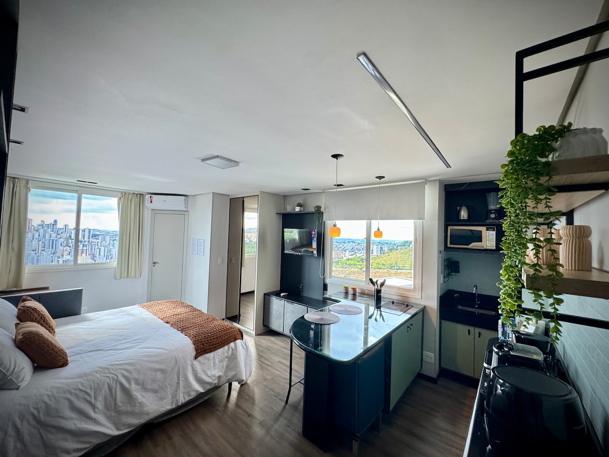Excelente studio recém construído a 5 minutos do BH Shopping. A acomodação também fica próxima ao bairro Buritis (10 minutos) e Savassi (15 minutos). É ideal para pessoas que viajam sozinhas ou casais! O studio ar condicionado, televisão smart, mesa para trabalho, vaga de garagem, além de wi-fi com boa velocidade. A cozinha possui micro-ondas, fogão por indução, frigobar e é toda equipada com os utensílios que você precisa para se sentir em casa! Oferecemos roupas de cama e banho limpas.