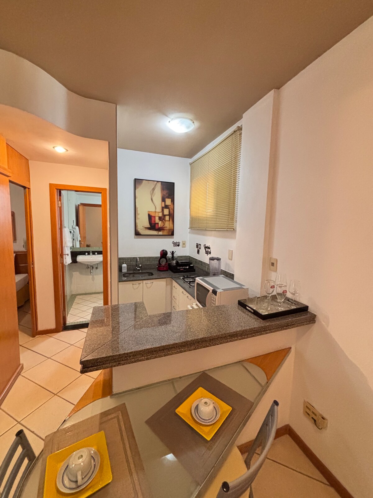 O Flat fica no mesmo prédio do Hotel Piemonte. Apartamento com uma suíte ampla e integrada com sala de estar e cozinha americana. O apartamento fica no 6° andar, possui elevador, portaria 24 horas e estacionamento incluído. Muito próximo à Alameda Oscar Niemeyer com acesso fácil ao comércio, restaurantes, bares, lojas, supermercados e farmácias.