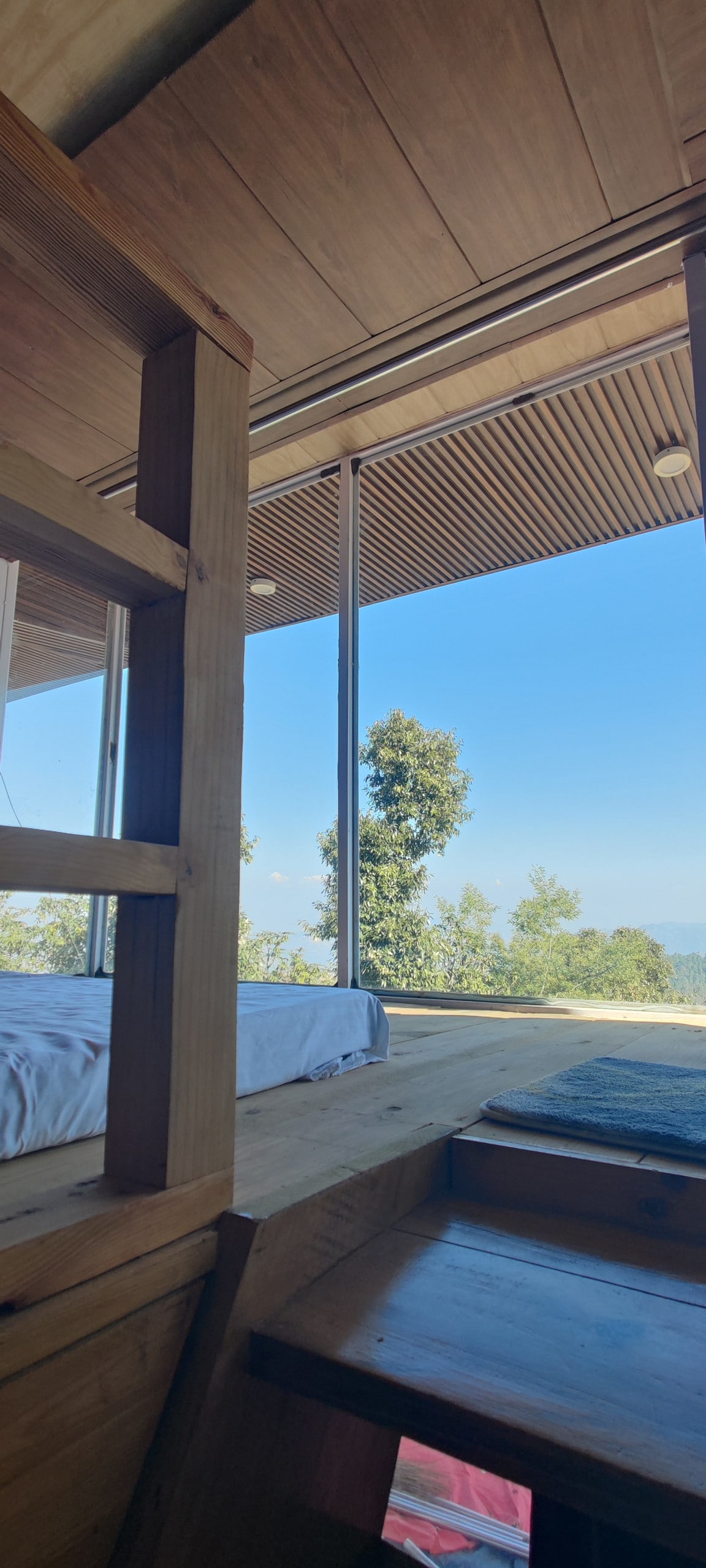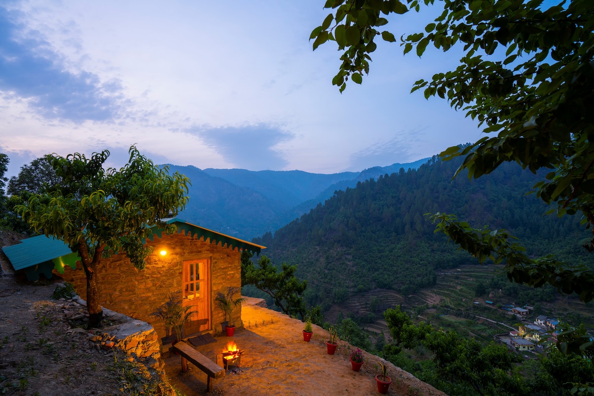 Perched on a peaceful hillside near Bhimtal within an estate, this hillside stay combines natural charm with modern comfort. With scenic views, it features a king-sized bed, wooden interiors, and a 32” TV; it’s designed for relaxation. Guests can savour sunset & sunrise vistas, unwind on the lawn with a BBQ & bonfire, or enjoy meals at the in-house dining. Close to Chota Kailash Dwar, trekking trails, Naukuchiatal (11.4 km) and the paragliding site (8.3 km), perfect for calm and adventure.