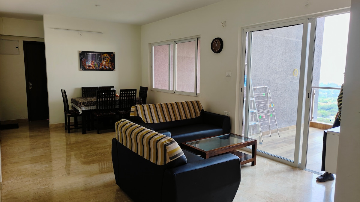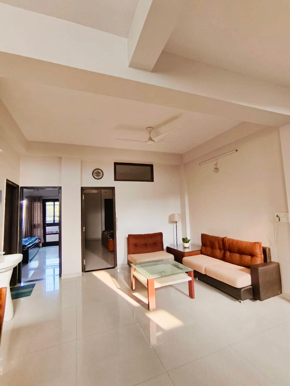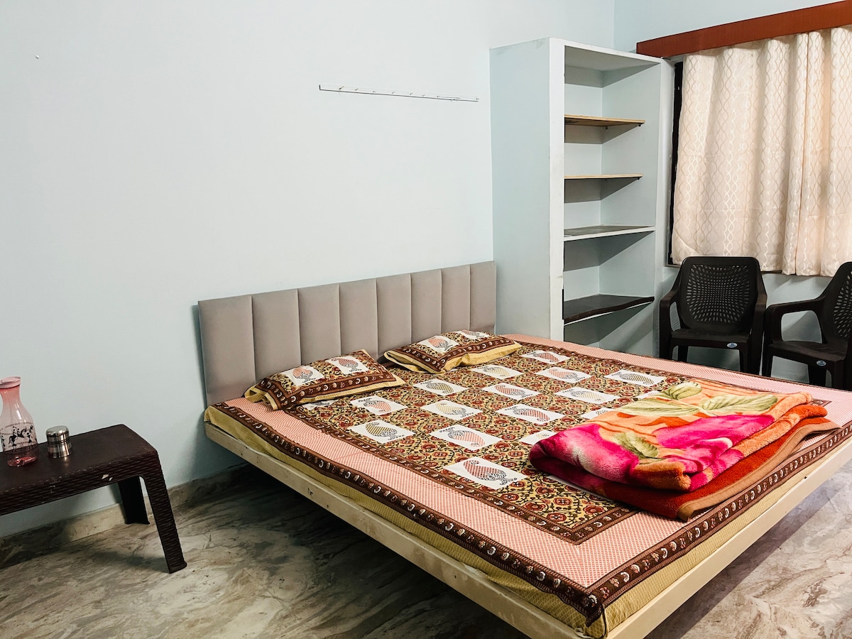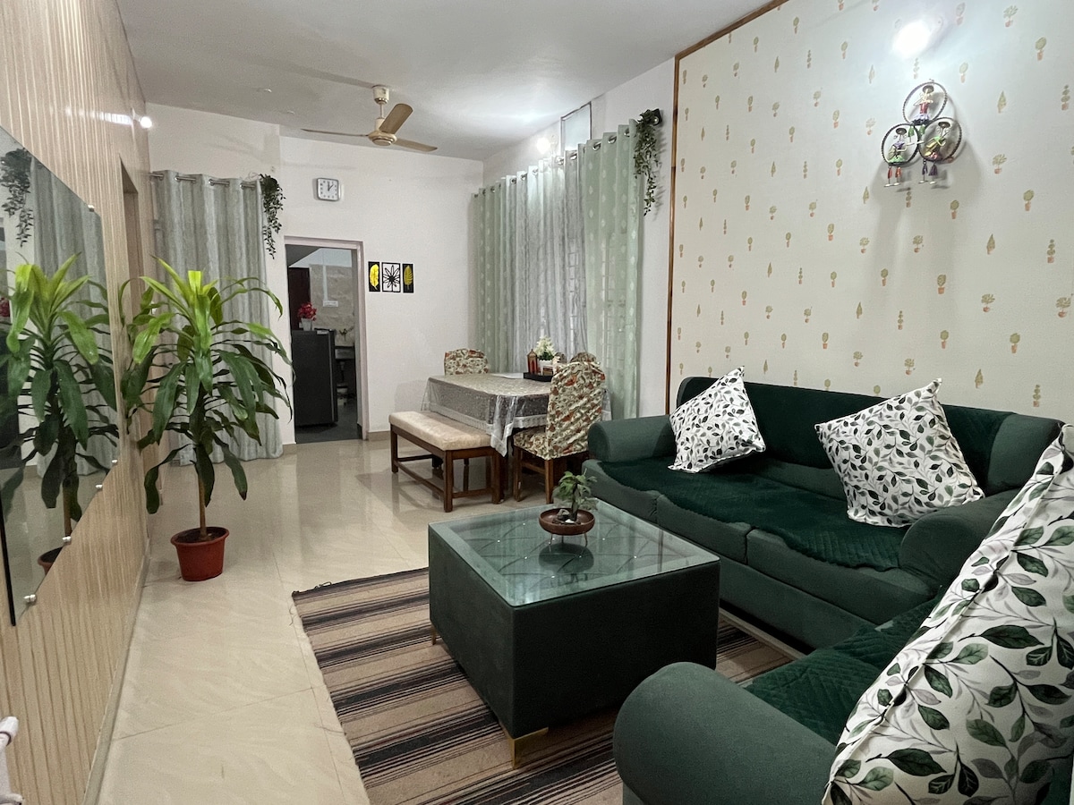 Enjoy our Fully Furnished Cozy 2 BHK Home Stay (2 Beautiful Bedrooms, A Hall/Living Area & A Kitchen), featuring: Kitchen Features - Fully equipped for self-catering - All necessary appliances and utensils provided - Ideal for cooking and dining - Refrigerator - Water purifier/RO - Geyser Comfort, entertainment & Convenience - 1 Big 56 Inch LED Smart TV - Music/Sound System - 1 AC with 2 fans in living area - Sofa cum bed in living area - Free Wi-Fi Spiritual Corner-Mandir/Pooja ghar