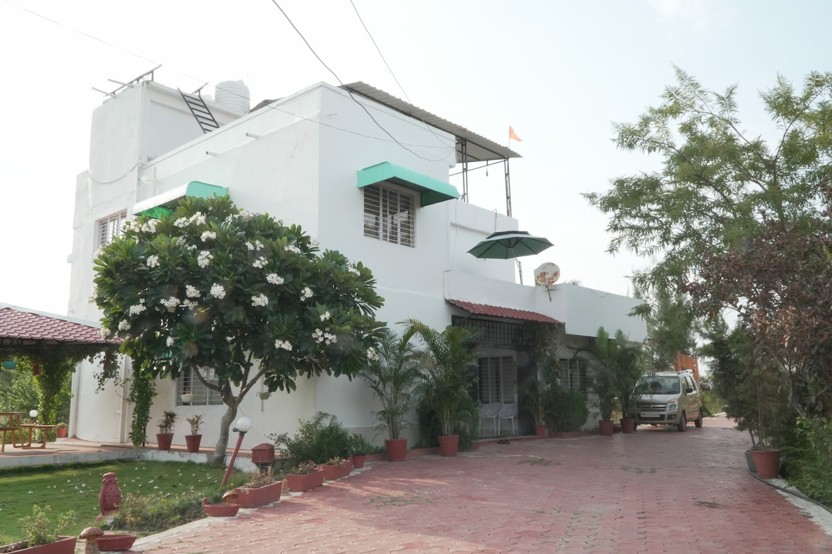 Escape to nature at our couple-friendly farmhouse! 🌿 Enjoy peace, privacy, and hill views that look even better than the photos. Wake up to birdsong, cool breezes, and relax on two cozy swings. The kitchen is fully equipped with masalas, RO water, fridge, and mixer and also a there's bicycle for you— perfect for long stays. Cook your own meals or visit nearby spots like Bapu Ki Kutiya, Vishnu Restaurant, Basil ,one malt or Sakshi Dhaba. A serene retreat for couples and friends alike. 💚