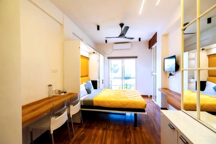 StayWorks is contemporarily designed unique Co-Work Co-live which provides you office work space & comfortable stays at one place. Work : as your personal office with high speed WIFI , Android Smart TV for presentations & inverter AC Stay: comfortable studio with smart double bed having memory foam mattress for orthopedic comfort, kitchenette with amenities & En-suite washroom. it's located on 2nd floor adjoin to Stayinn