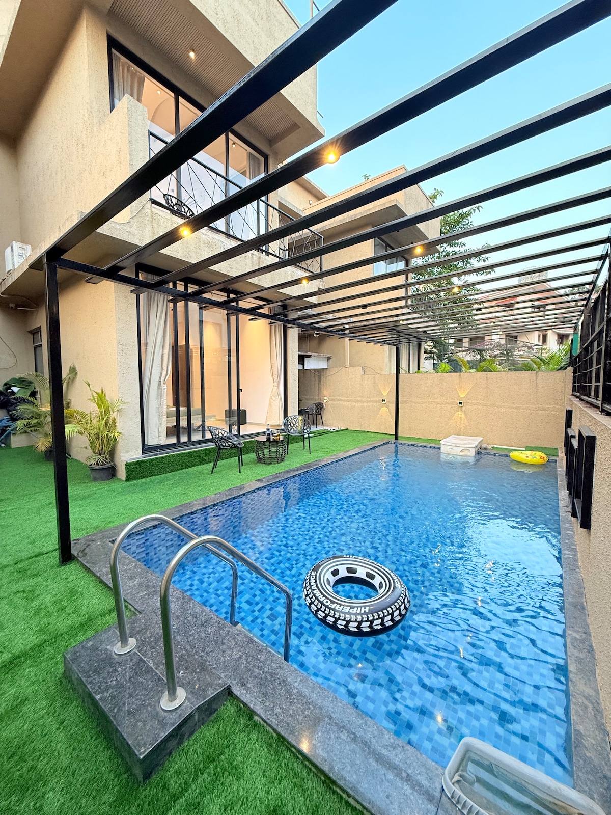 Experience a serene retreat, a picturesque 3-BR 4-Bath farmhouse in Nasrapur, Karjat. This haven, adorned by lush greenery, features a pool, a flowing river & featured in Hotelier India. Crafted with love, the rustic design offers spacious, open areas, inviting a sense of freedom & communion with nature—an ideal escape for a city detox. It stands out for commitment to environmental sustainability. This villa can sleep 15 guests overnight & 30 guests for the day making it ideal for parties.