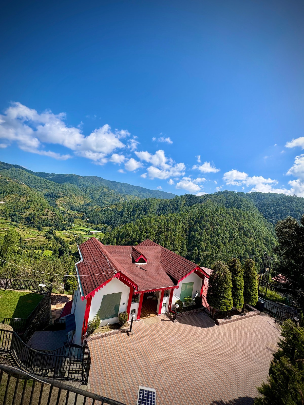 Perched at 7,500 ft in Uttarakhand, our 3,200 sq. ft. homestay offers modern comfort with 270° Himalayan views. Surrounded by lush flora and fauna, it's a serene escape near Kainchi and Mukteshwar Dham. Enjoy elegant interiors, cozy evenings, panoramic balconies, and nearby nature trails. Perfect for peace seekers, families, and nature lovers—your ideal mountain sanctuary awaits. Parking is available on the main road at your discretion and there is a 180 metre walk from the parking to property