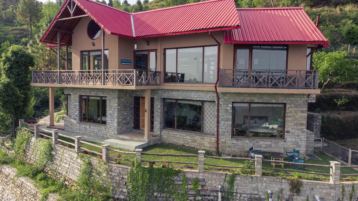 "The cottage is situated in beautiful valley surrounded by farms and orchards. Oak trees forest approachable walk on river basin. A dream getaway from the hustle bustle of city life, it is tastefully furnished and is a fine combination of traditional architecture & modern designs. Guest can absorb the beauty of valley while having scrumptious food at the in-house Kitchen. Property has plenty of outdoor space for sports activities Basketball, Volleyball,Badminton & kids playing area.