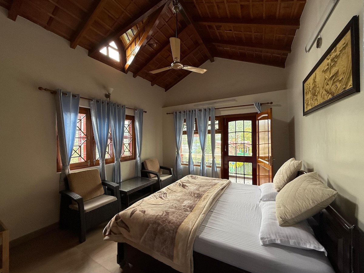 For 2 adults and two kids. A two- storeyed, A shaped Glass- Wood- And- Stone studio villa amidst an Avocado canopy and a small Kiwi vineyard and quite a few rare flower plants in the premise of our ancestral property. Vinatge setting, a fireplace, a freshwater spring, many ponds, a hammock and the constant chirp of birds to keep you company. Ideal for trekkers, readers, bird wacthers, nature lovers, meditation practitioners or people just looking for a quiet spot in a forest.