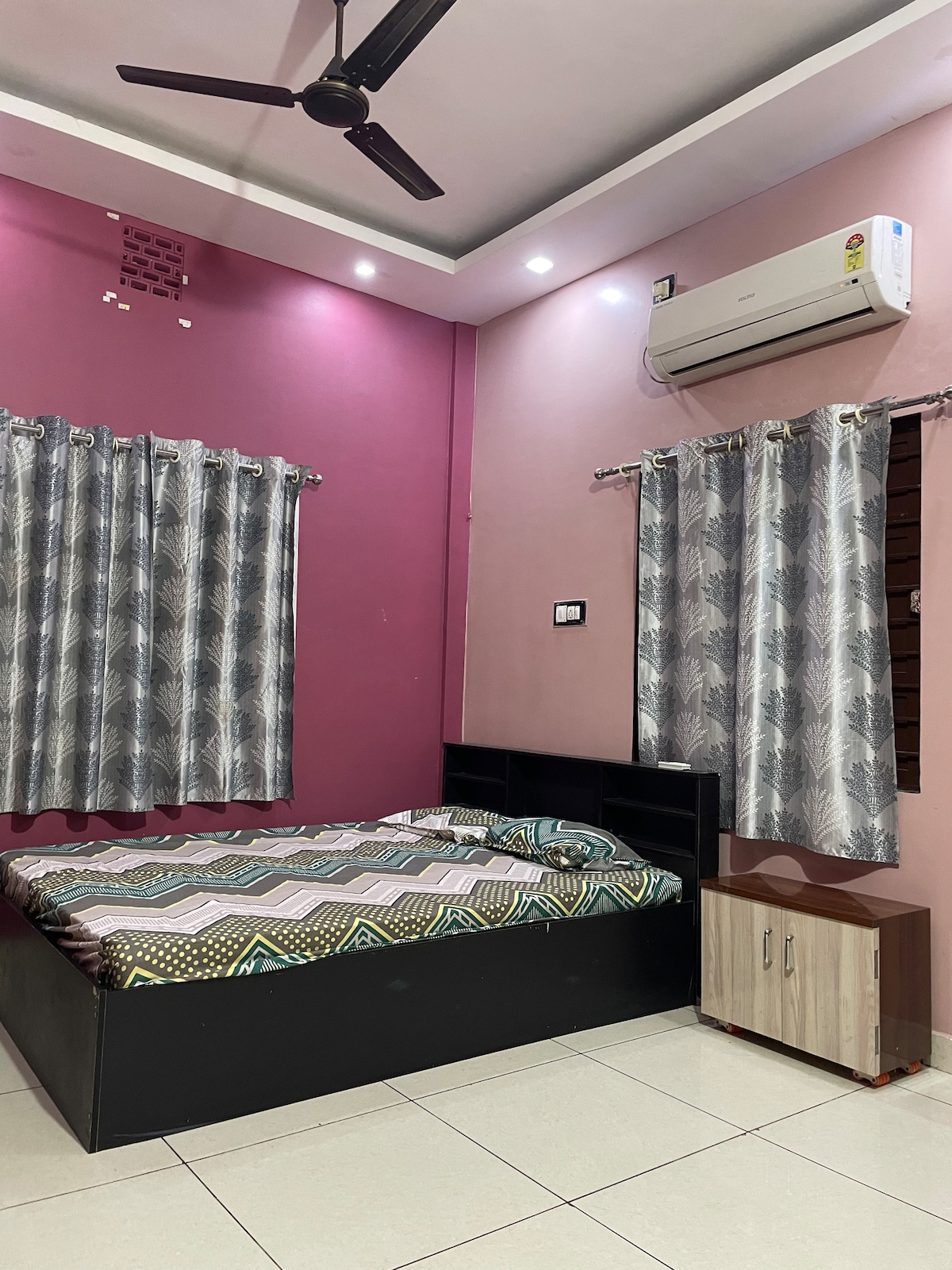 A fully furnished cozy private studio 1 bhk with all the amenities of a home, away from home. Kitchen is well equipped with a water purifier, induction cooker and a microwave with automatic chimney, a Geyser for hot water and a 1.5 ton air conditioner with a low level bed for a peaceful sleep at night. The hall has a Diwan bed cum Sofa & a 44 inch smart TV for entertainment with a 100 Mbps Wifi for your work from home needs. Forget your worries in this spacious and serene space.