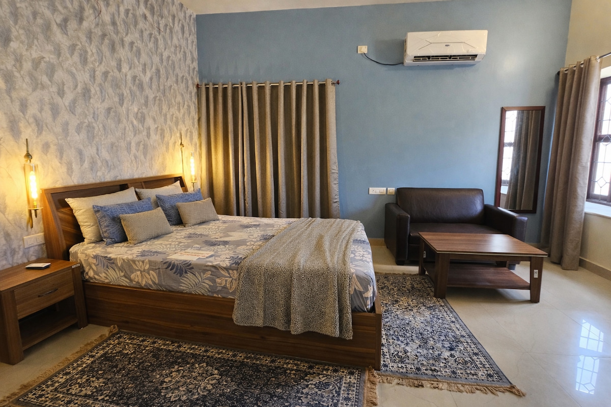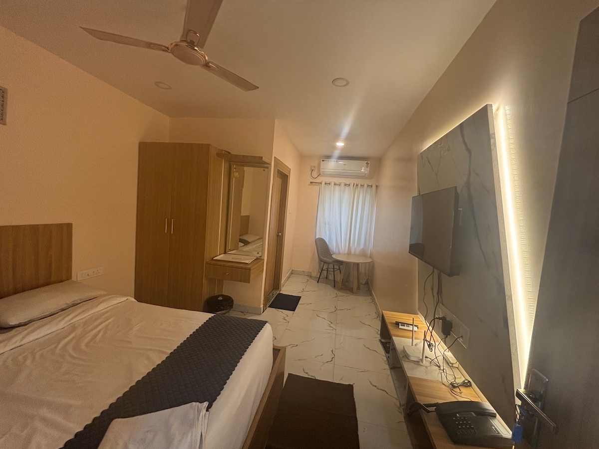 Comfortable in this spacious and unique space. Well ventilated, neat and clean rooms. Everything available nearby, Silent and peaceful. Balcony, Self cooking kitchen. In house restaurant. Self drive car, pick up, drop facilities available. city guide and temple guide available. Functions, Events, Parties allowed with additional changes. Pets allowed with additional changes. Events and parties allowed with additional charges upon request. Designated smoking zone.Station and Airport 1.5 KM away.