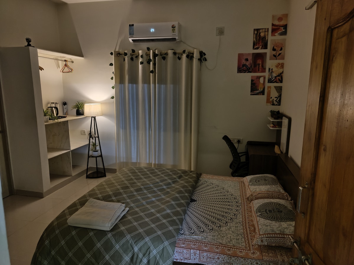 Beautifully decorated place for 2. You get- 1 spacious room (AC) - queen size bed + orthopedic mattress 1 attached toilet with comod 1 private washroom with indian toilet. 1 study table with comfortable chair 1 closet. Open terrace with plants. Not included: Geyser (you can ask for immersion rod) Wifi (Good network here so mobile internet will have no issues) Inverter (Not much power cuts in the area so generally it isn't a problem) No Lift (You have to use stairs for 2bd Floor)